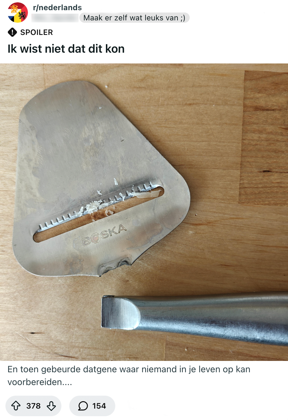 Als kaas ter sprake komt, weet je bijna zeker dat de Boska-kaasschaaf genoemd gaat worden. Veel Nederlanders zijn er helemaal weg van en richten nog nét geen praatgroep op om de perfecte plakken die deze rakker kan maken te aanbidden. Toch kan de kaasschaaf je blijkbaar ook teleurstellen. Een Reddit-gebruiker belandt namelijk in een verschrikkelijke situatie waar elke eigenaar van een Boska-kaasschaaf nachtmerries van krijgt.