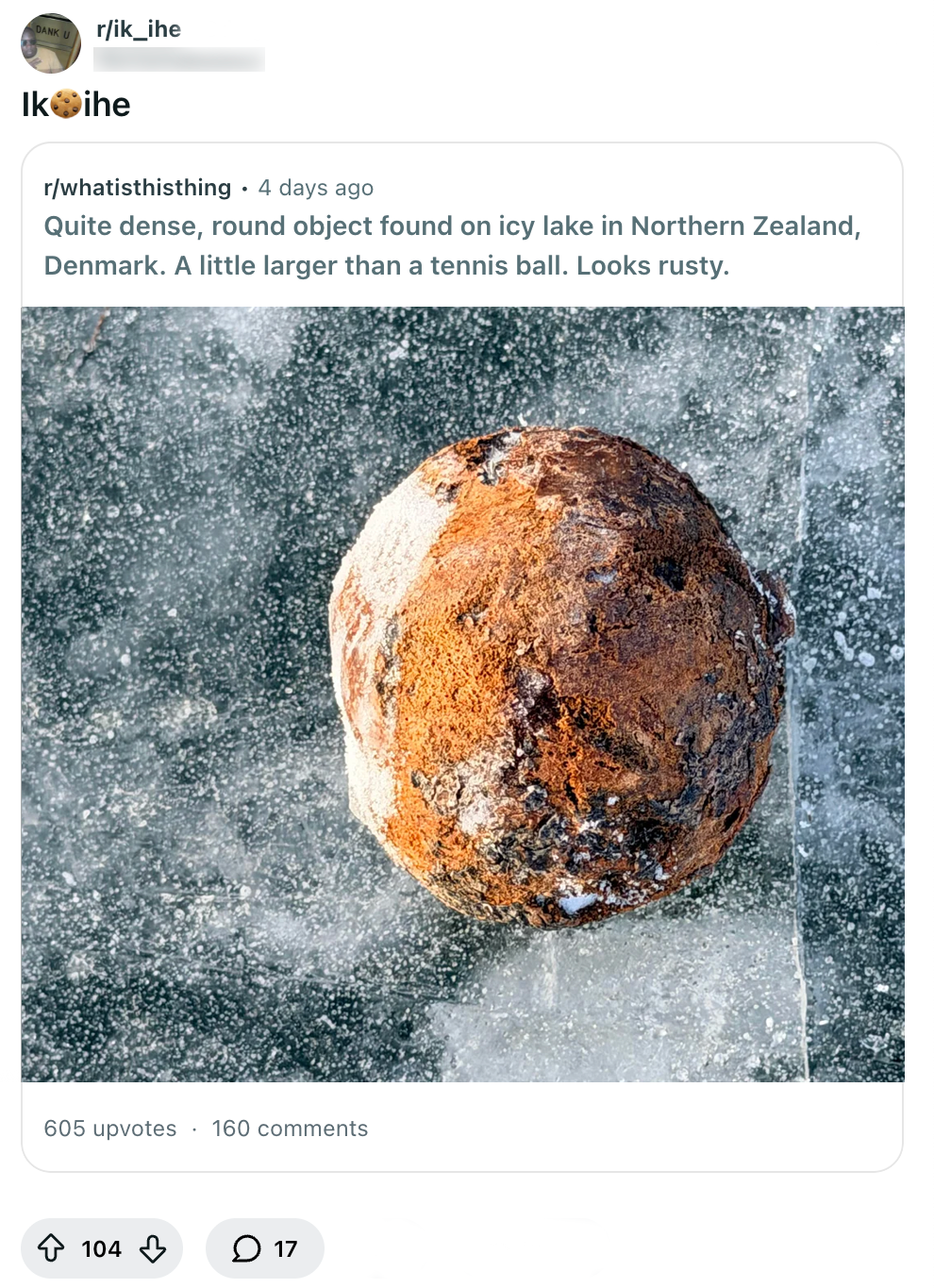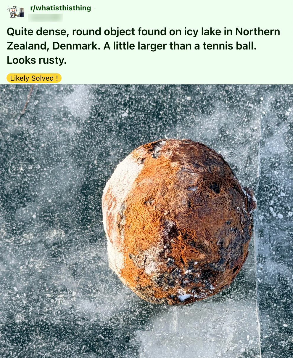 r/whatisthisthing - Quite dense, round object found on icy lake in Northern Zealand, Denmark. A little larger than a tennis ball. Looks rusty.