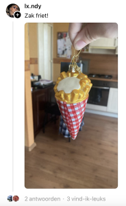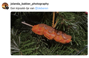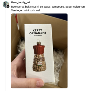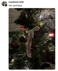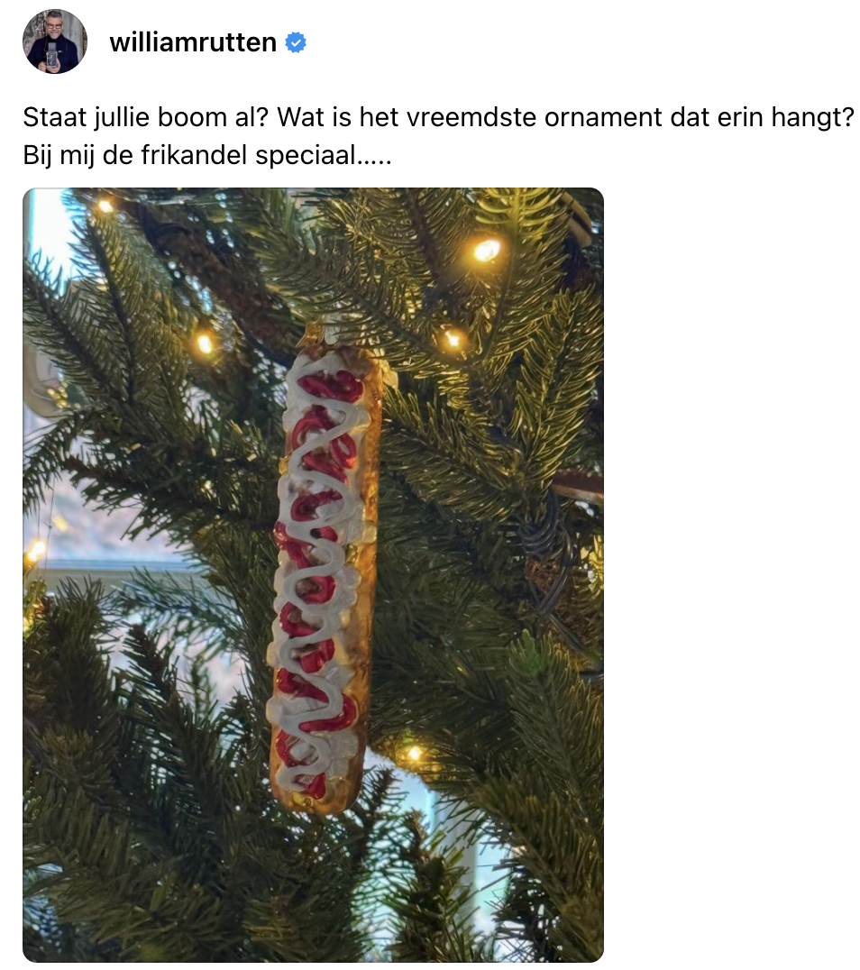 Tegenwoordig hangen we veel meer in onze kerstboom dan alleen een paar simpele ballen. Vorig jaar hingen er bijvoorbeeld slaapkamerspeeltjes, kaassoufflés en ballerina-koeien aan jullie wonderschone takken. Om ook dit jaar weer indruk te maken op vrienden en familie zijn de meest vreemde kerstornamenten uit de kast getrokken. Op Threads vraagt William Rutten wat het raarste ornament is dat in iedereen in zijn boom heeft hangen en de foto’s die worden gedeeld liegen er niet om.