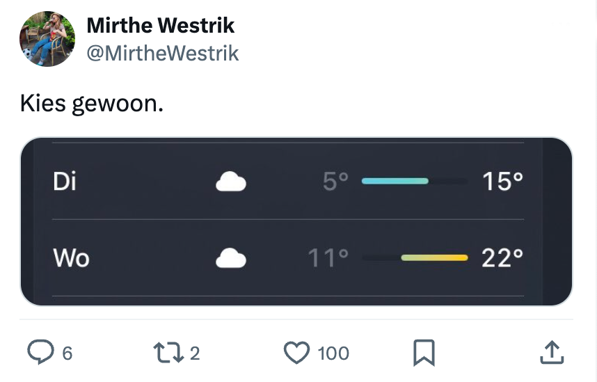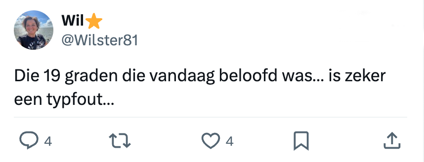 2. Hoewel je weerapps niet altijd kan vertrouwen, weet Jorren toch wel zeker dat het 23 graden wordt.