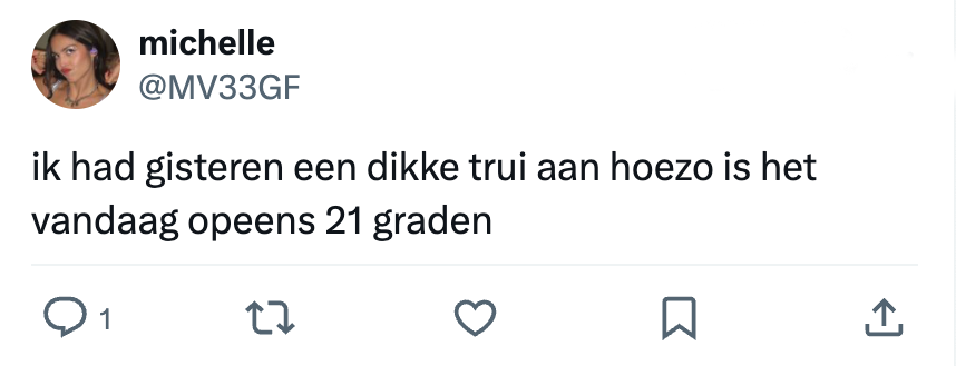 Wanneer je aan de herfst denkt, denk je meestal aan warme chocomel, mooie roodkleurige bladeren aan de bomen en lekker op de bank hangen terwijl de regen met bakken uit de hemel komt vallen. Maar als je de weersvoorspelling van vandaag mag geloven, kan je beter in je korte broek op het strand gaan zitten met een lekkere, frisse cocktail. Het wordt op sommige plekken namelijk maar liefst 23 graden vandaag. Normaal wordt zo’n weerbericht uitbundig gevierd in Nederland, maar deze keer reageren Nederlanders vooral vol ongeloof.