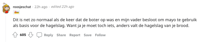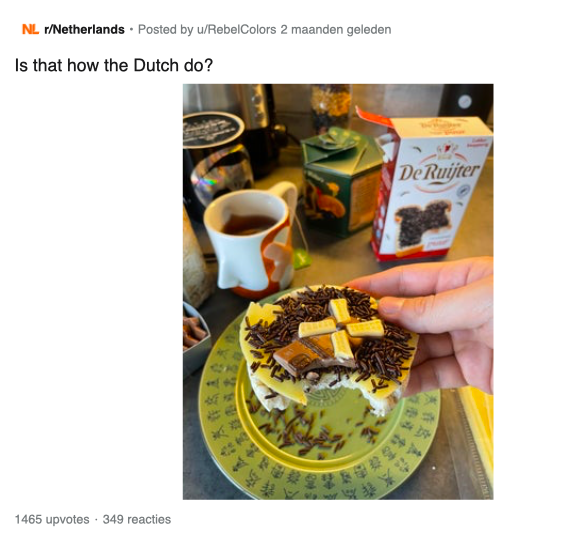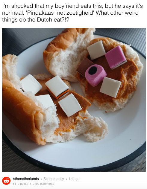 Nederlanders hebben best raar broodbeleg als je erover nadenkt: beschuit met muisjes, gestampte muisjes, vruchtenhagel of speculoos. Maar het kan nog gekker, blijkt uit een Reddit-post die gisteren verscheen. Iemand doet namelijk Engelse drop op een bolletje met pindakaas. In de reacties geven mensen nog meer voorbeelden van rare eetcombinaties.