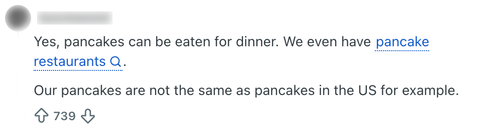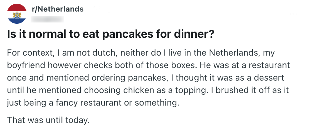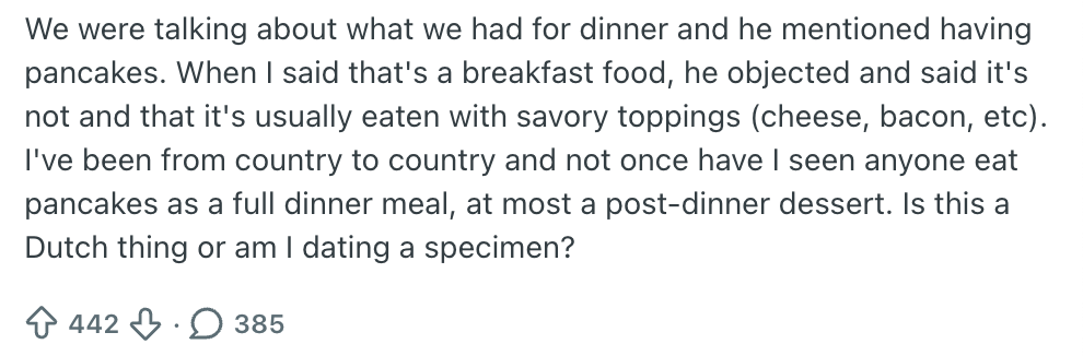 Nederlanders hebben nogal wat bijzondere gewoontes. Zo zullen buitenlanders opkijken als je fanatiek op zoek gaat naar aanbiedingen voor zonnebrand of ze een Tikkie van vijf cent krijgen voor het zakdoekje dat ze van je hebben gekregen. Volgens deze Reddit-gebruiker vertoont z’n Nederlandse partner opvallend eetgedrag, en vraagt diegene of andere Nederlanders hetzelfde doen. En jawel: zo vriendelijk als we zijn, wordt-ie al snel uitgemaakt voor ‘pannenkoek’.
