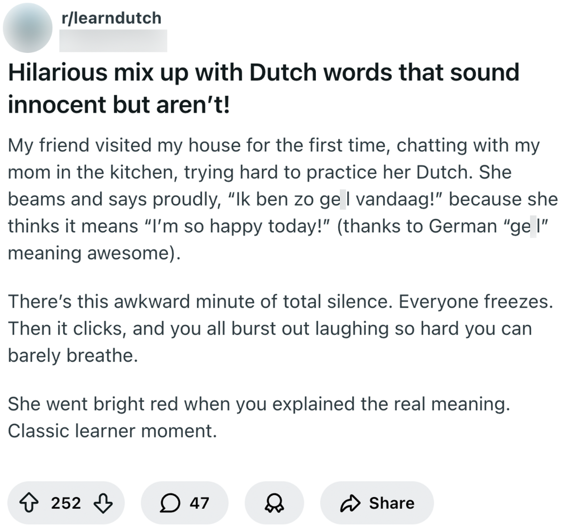 Wie Nederlands leert, ontdekt al snel dat de taal vol valkuilen zit: woorden die onschuldig lijken maar dat helemaal niet zijn, en zinnen die je beter twee keer kunt checken voordat je ze hardop uitspreekt. Een vrouw die Nederlands leert, loopt daartegenaan. Zij wil laten weten dat ze heel blij is, maar gebruikt een woord waarvan iedereen in de ruimte spontaan rood aanloopt.