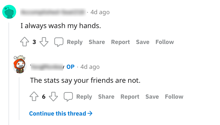 Het blijft mensen die naar Nederland verhuizen alsmaar verbazen dat Nederlandse mannen hun handen niet wassen na een bezoek aan het toilet. Uit een wat ouder onderzoek van GallUp (uit 2019) is zelfs gebleken dat Nederland op dit gebied het minst hygiënische land is van Europa. Vijftig procent van de mannen geeft aan de handen niet na ieder toiletbezoek te wassen met water en zeep. Maar als dit op Reddit gedeeld wordt, valt er opeens een oorverdovende stilte: niemand lijkt er eerlijk voor uit te durven komen.