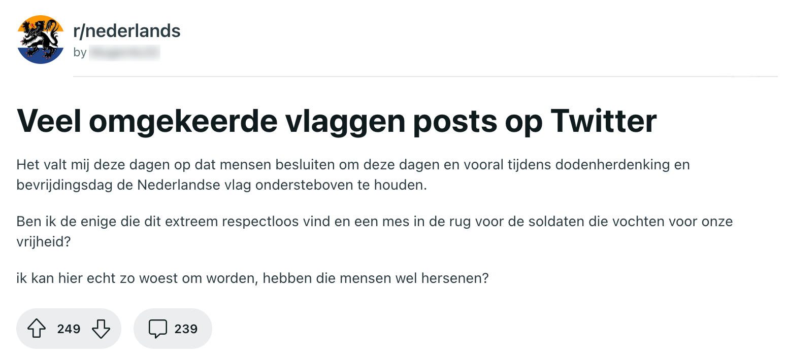 Vandaag is het Nationale Dodenherdenking. Nederlanders hangen traditiegetrouw hun vlag halfstok om stil te staan bij alle oorlogsslachtoffers. Het valt echter veel mensen op dat deze traditie er dit jaar anders aan toe gaat. Sommige Nederlanders hangen namelijk hun vlag omgekeerd halfstok, wegens politieke redenen. Deze Reddit-gebruiker geeft aan de omgekeerde vlaggen op deze dag respectloos te vinden. En dat zorgt voor een flinke discussie.
