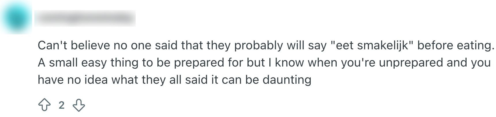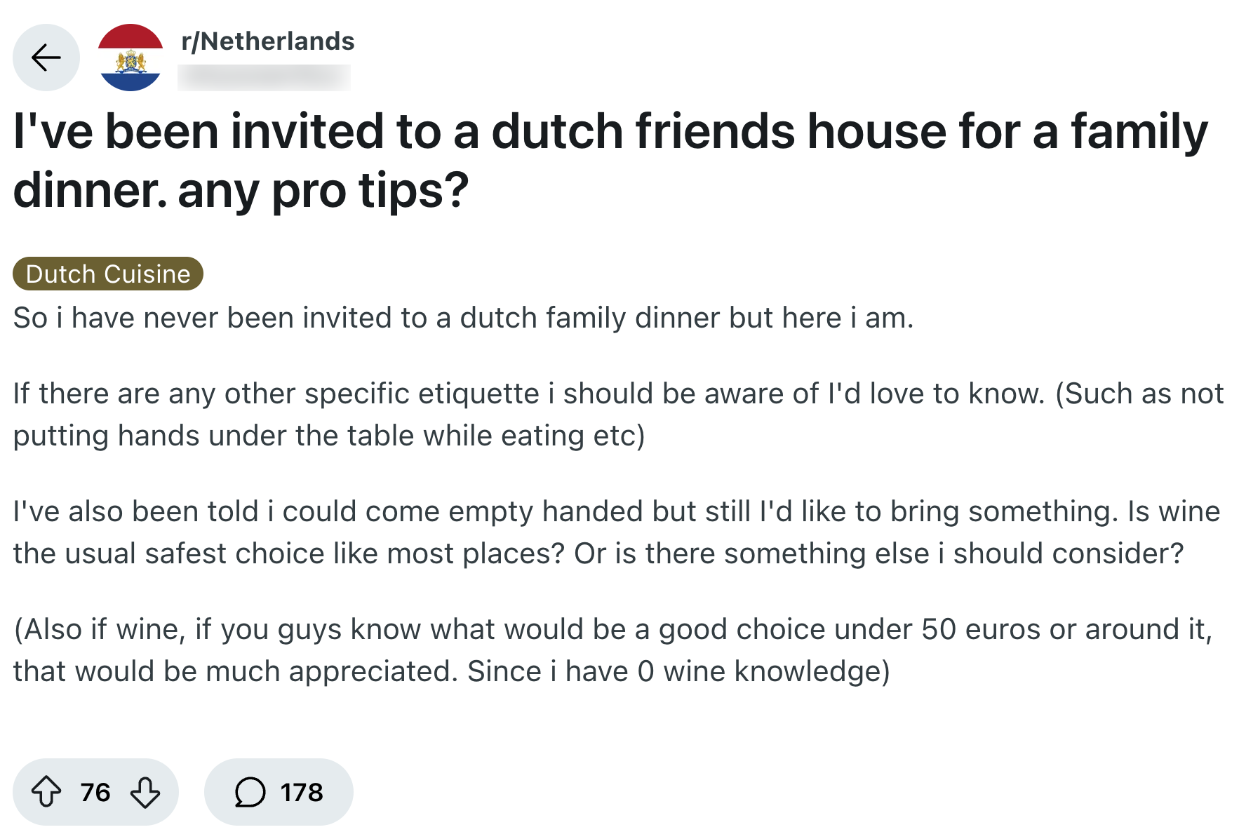 Als je op vakantie naar het buitenland gaat, wil je je toch een beetje aanpassen aan de lokale eetgewoonten. Niet alleen omdat restaurants vaak nog dicht zijn om zes uur, maar ook omdat het wel zo beleefd is. Als deze expat dus door een Nederlander wordt uitgenodigd om mee te eten, wil-ie natuurlijk een goede indruk maken. Daarom wordt Reddit direct ingeschakeld als hulplijn, en dat levert een hoop ‘nuttige’ tips op.