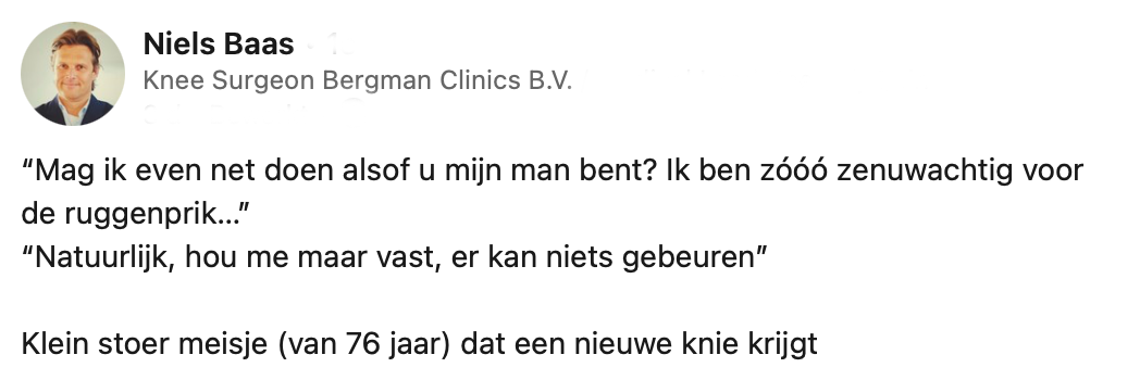 Wanneer je geopereerd moet worden, is dat altijd spannend. Dan is het extra fijn als de betrokken zorgmedewerkers je een hart onder de riem steken. Chirurg Niels deelt een bijzonder moment uit de operatiekamer en laat zien hoe iets kleins het verschil kan maken.