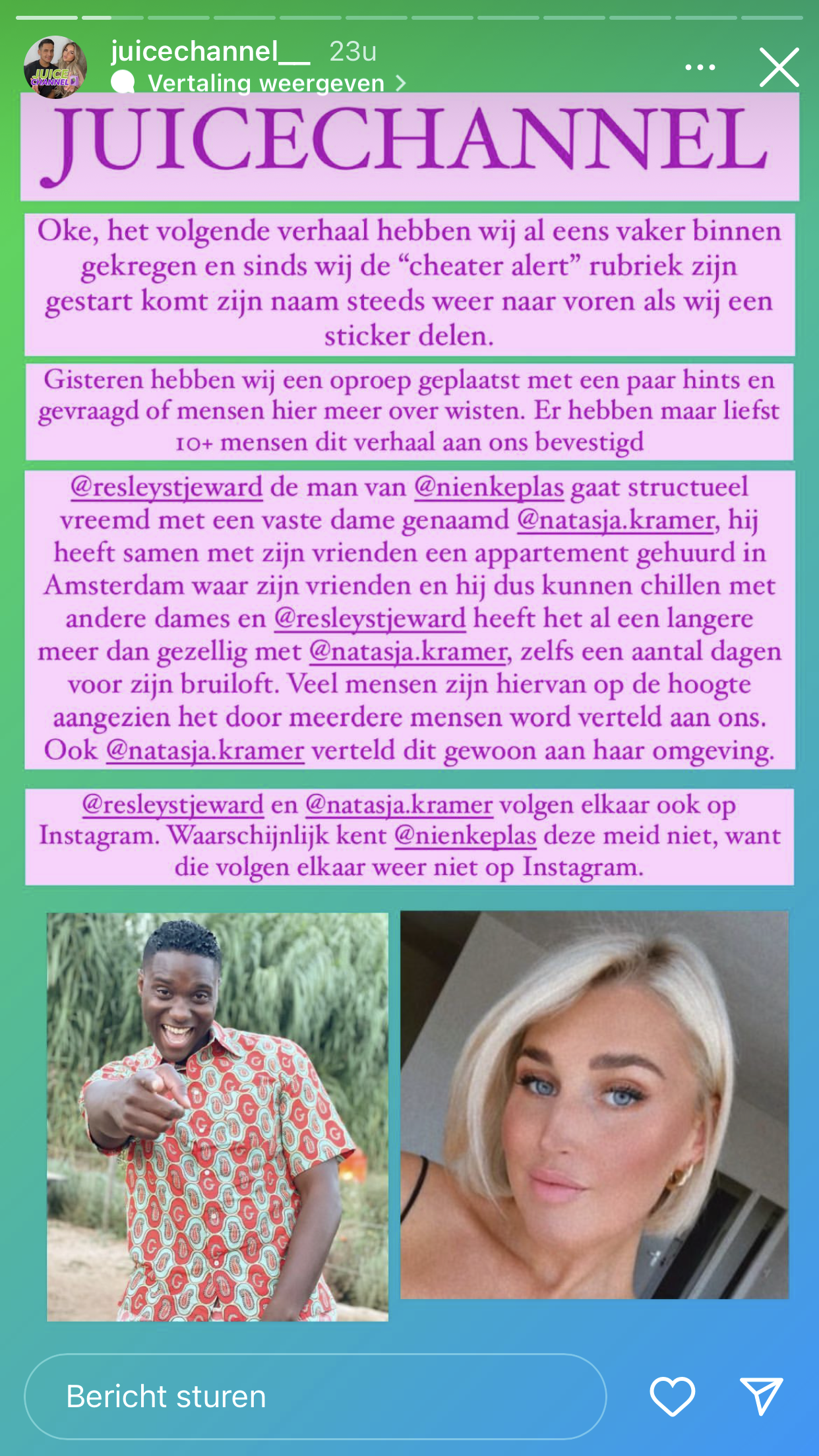 ‘Als je geschoren wordt, moet je stilzitten’ zegt men, maar hier trekken Nienke Plas en haar vriend Resley zich niets van aan. Resley werd gisteren door Juice Channel beschuldigd van vreemdgaan. Yvonne Coldewijer deelde deze roddel ook direct op haar Insta Story, waarbij ze bevestigde dat ze ditzelfde verhaal ook van haar spionnen had gehoord. Maar waar veel BN’ers na zo’n beschuldiging even wijselijk onder een steen gaan liggen en compleet van de aardbodem verdwijnen, pakken Nienke en Resley de koe bij de horens.