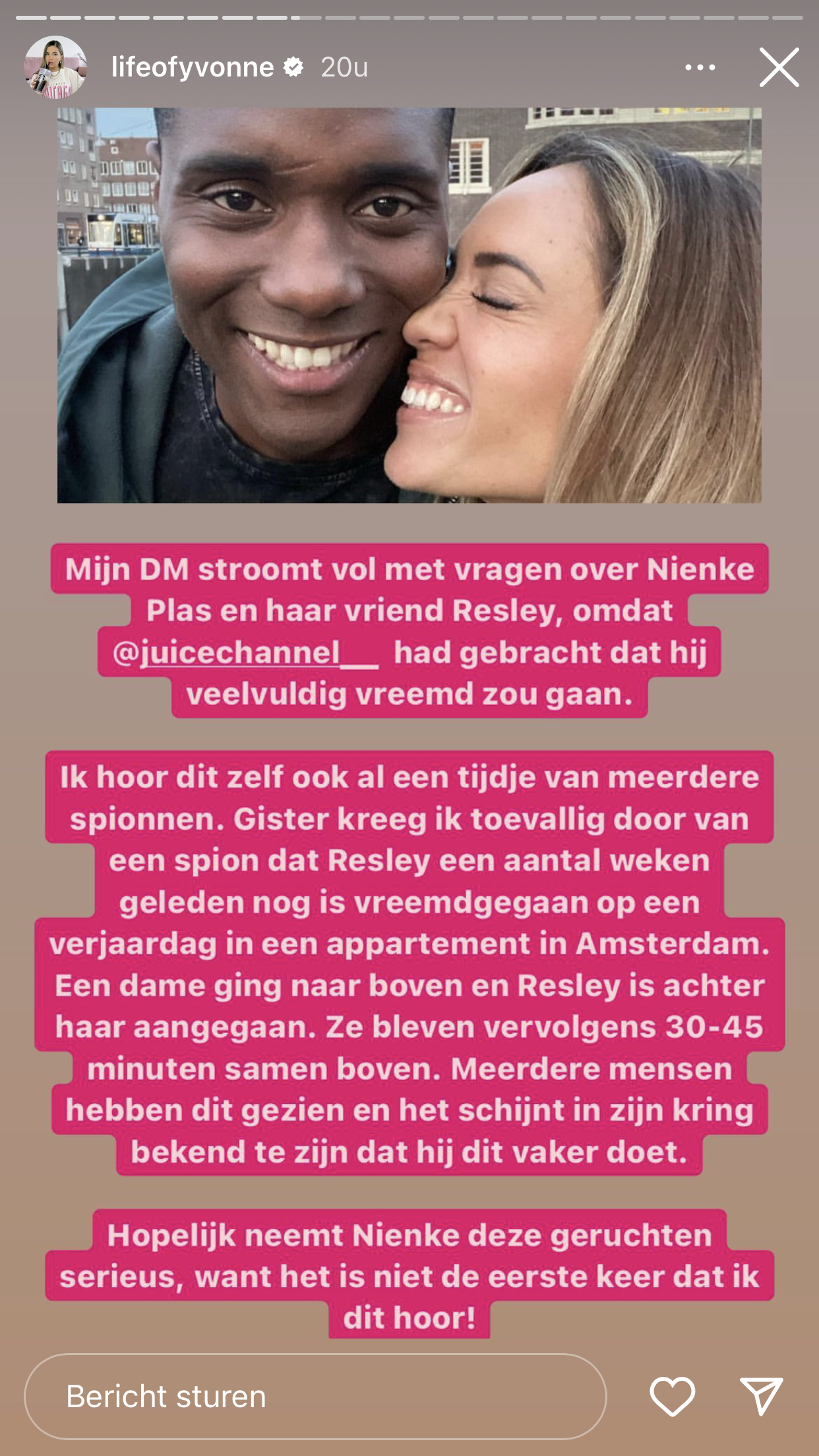 ‘Als je geschoren wordt, moet je stilzitten’ zegt men, maar hier trekken Nienke Plas en haar vriend Resley zich niets van aan. Resley werd gisteren door Juice Channel beschuldigd van vreemdgaan. Yvonne Coldewijer deelde deze roddel ook direct op haar Insta Story, waarbij ze bevestigde dat ze ditzelfde verhaal ook van haar spionnen had gehoord. Maar waar veel BN’ers na zo’n beschuldiging even wijselijk onder een steen gaan liggen en compleet van de aardbodem verdwijnen, pakken Nienke en Resley de koe bij de horens.
