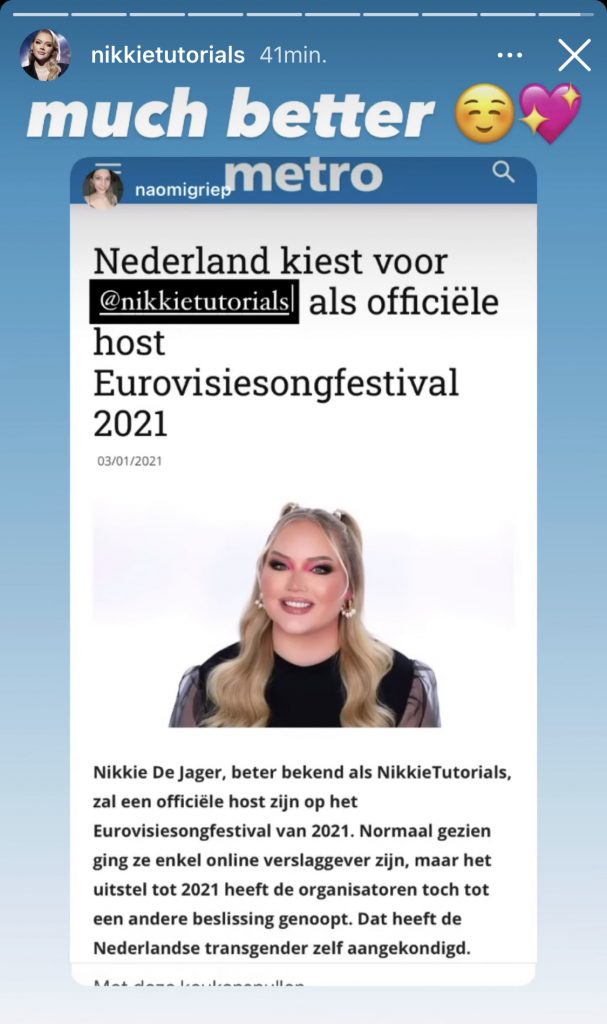 NikkieTutorials is bij de komende editie van het Eurovisie Songfestival toegevoegd aan het presentatie-team. Ook de Belgische nieuwswebsite Metro schrijft over het heugelijke nieuws, maar doet dat op een wel heel pijnlijke manier. En Nikkie de Jager zelf is er helemaal klaar mee.