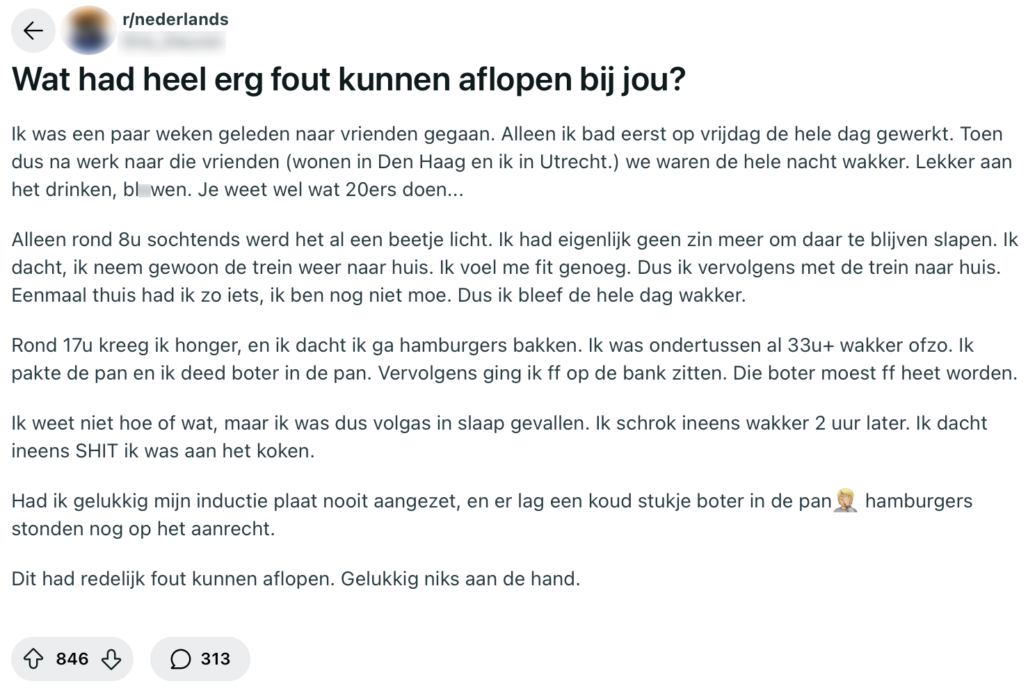 Iedereen komt weleens in een situatie terecht die heel anders had kunnen aflopen. Zo fiets je regelmatig bijna de sloot in na een avondje stappen, steek je zonder te kijken de weg over en vind je nét op tijd je evenwicht terug voordat je onderuitgaat. Vaak besef je pas achteraf hoeveel geluk je hebt gehad. Op Reddit vraagt iemand zich af welke noodsituatie voor anderen anders had kunnen aflopen, en krijgt daar flink wat reacties op.