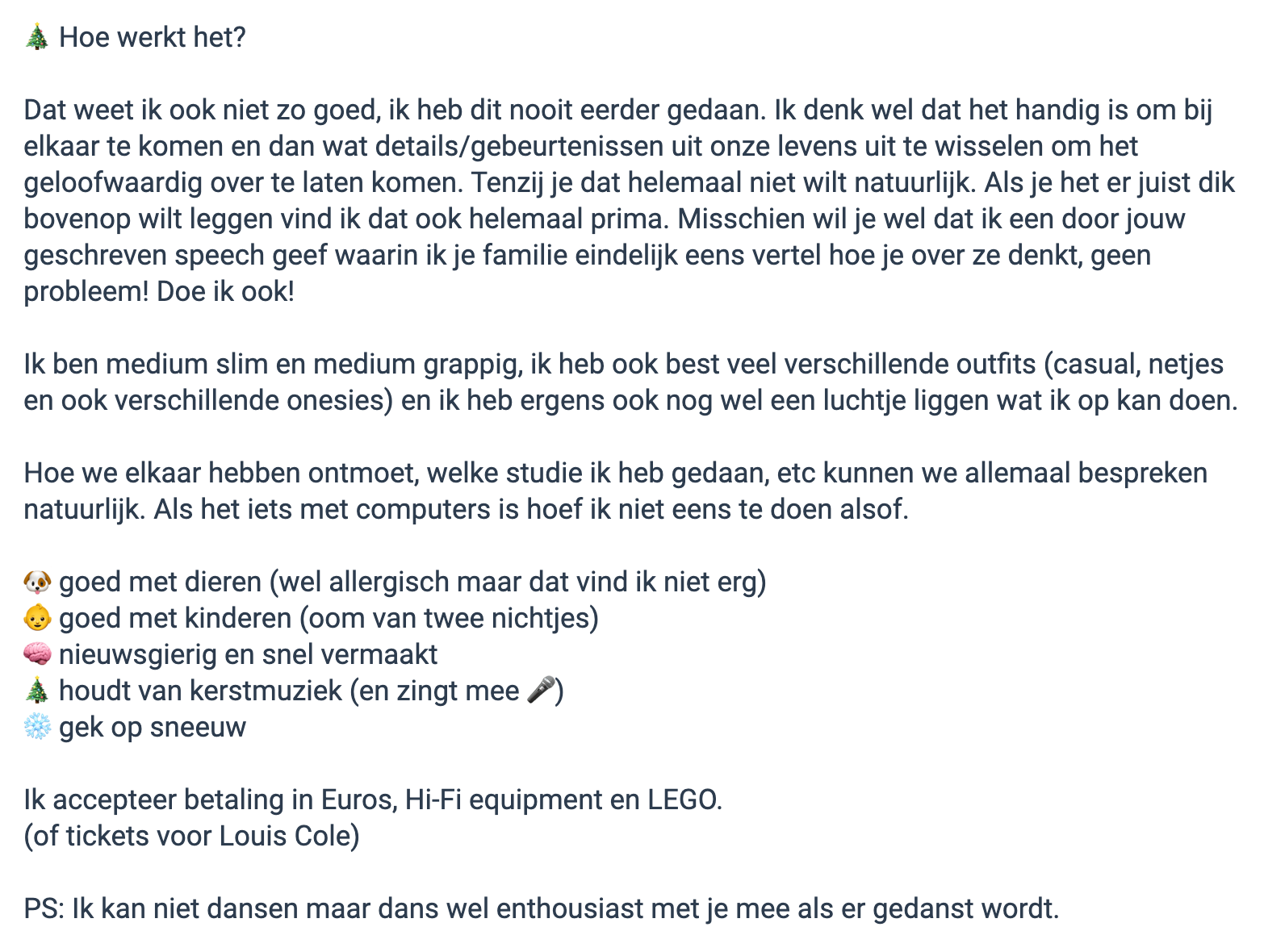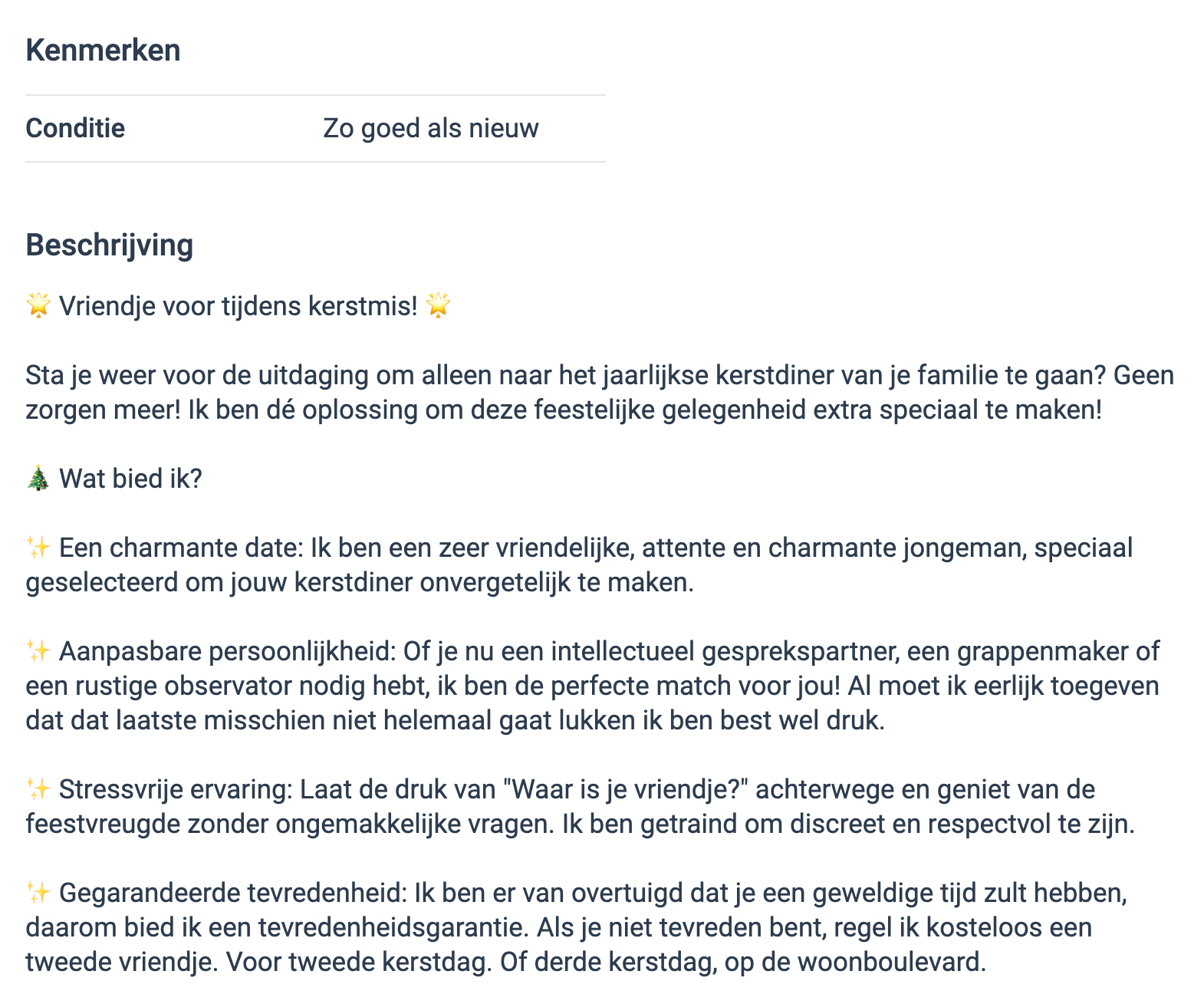 Ben je dit jaar weer vrijgezel tijdens kerst? Ben je helemaal klaar met de vervelende vragen van je oom en tante over wanneer je nu eindelijk een relatie krijgt, want de tijd begint zogenaamd te tikken? Heeft zelfs je jongere zusje al iemand aan de haak geslagen? En wordt de aandacht nu nóg meer gericht op wat jij als vrijgezel allemaal uitspookt? Geen paniek: Norbert heeft de ideale oplossing voor iedereen die iemand mee wil nemen tijdens het kerstdiner. Hij zette zichzelf voor de grap op Marktplaats als vriendje, maar krijgt nu daadwerkelijk biedingen binnen.