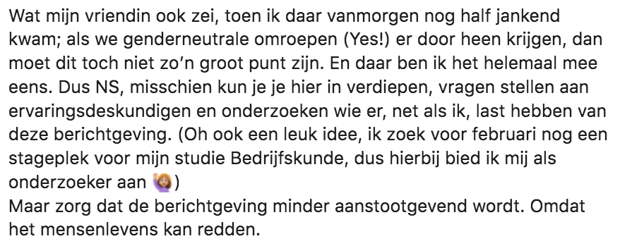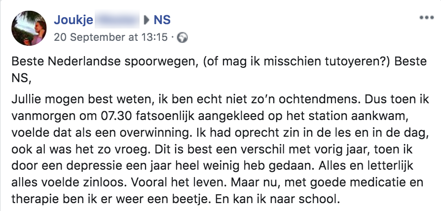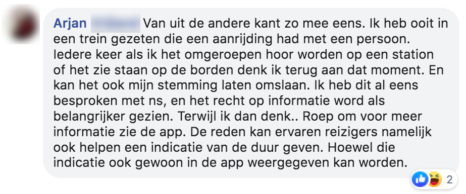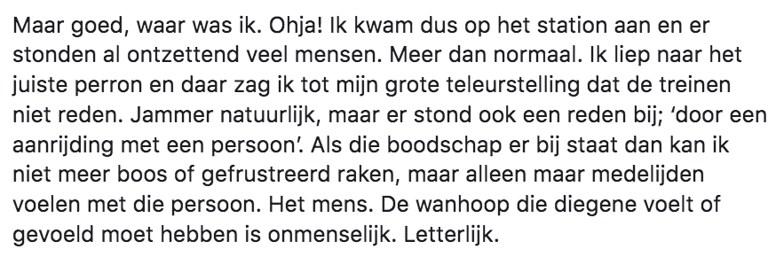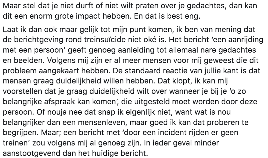 We hebben allemaal wel eens meegemaakt dat onze trein niet reed. Soms is dan de reden die via de intercom wordt opgeroepen: ‘vanwege een aanrijding met een persoon’. Joukje laat op Facebook weten dat deze verwoording haar wat doet. Ze ziet graag verandering en legt in haar bericht uit waarom. En een jaar later, is het een boodschap die nog lang gezien en gehoord mag worden.