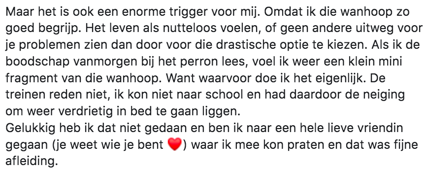 We hebben allemaal wel eens meegemaakt dat onze trein niet reed. Soms is dan de reden die via de intercom wordt opgeroepen: ‘vanwege een aanrijding met een persoon’. Joukje laat op Facebook weten dat deze verwoording haar wat doet. Ze ziet graag verandering en legt in haar bericht uit waarom. En een jaar later, is het een boodschap die nog lang gezien en gehoord mag worden.