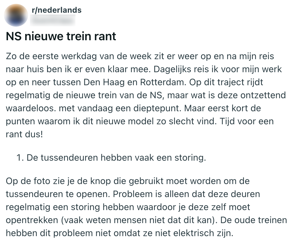 Als de achterkant van je Fiat Panda met tien kilometer te hard een paaltje kust, laat je die schade waarschijnlijk repareren. Maar mocht die reparatie te duur uitvallen, dan mag dat koekblik toch echt plaatsmaken voor een vervanger. Zo denkt NS in feite ook over hun ‘burgerrupsen’. Een tijd geleden hebben zij nieuwe treinen losgelaten op het spoor, en reizigers hebben inmiddels genoeg tijd gehad om daar een mening over te vormen. Een treinreiziger heeft dan ook een hartig woordje te spreken met de designer van de nieuwe intercity, en doet dat publiekelijk op Reddit.