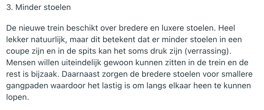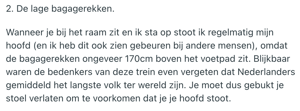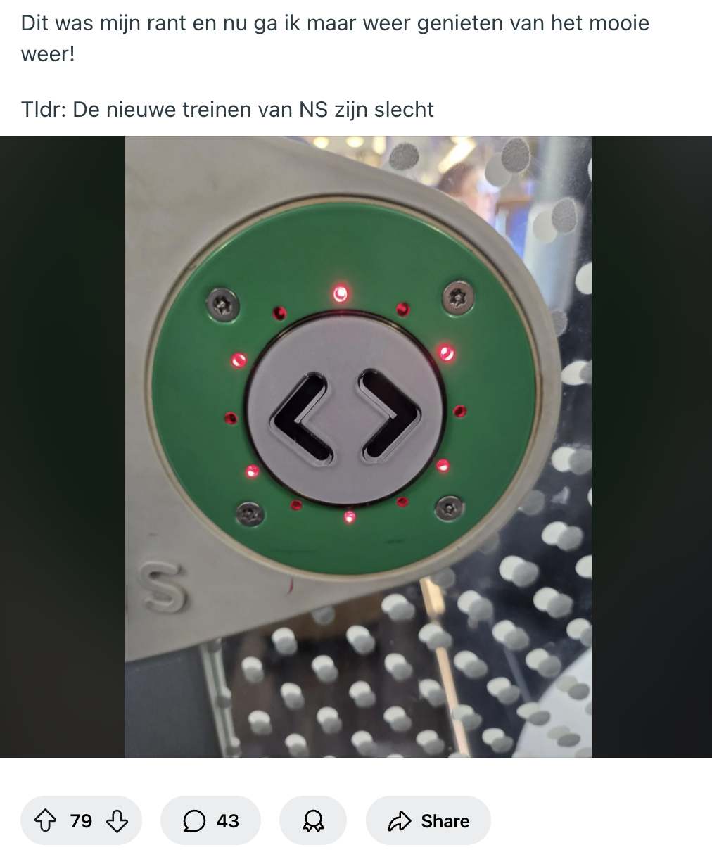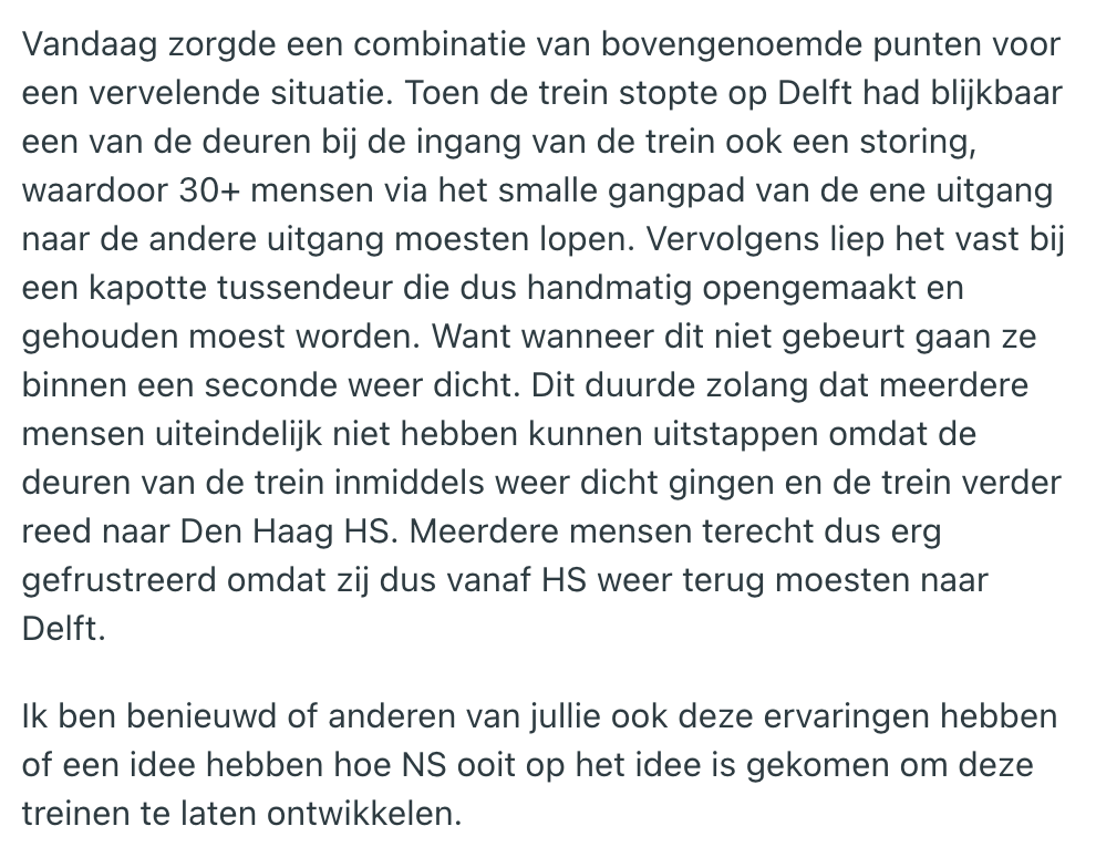 Als de achterkant van je Fiat Panda met tien kilometer te hard een paaltje kust, laat je die schade waarschijnlijk repareren. Maar mocht die reparatie te duur uitvallen, dan mag dat koekblik toch echt plaatsmaken voor een vervanger. Zo denkt NS in feite ook over hun ‘burgerrupsen’. Een tijd geleden hebben zij nieuwe treinen losgelaten op het spoor, en reizigers hebben inmiddels genoeg tijd gehad om daar een mening over te vormen. Een treinreiziger heeft dan ook een hartig woordje te spreken met de designer van de nieuwe intercity, en doet dat publiekelijk op Reddit.