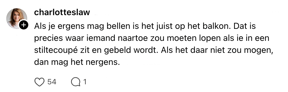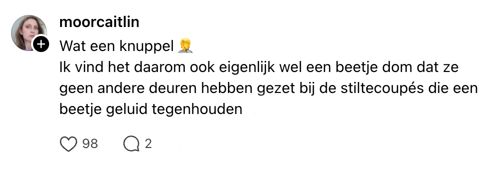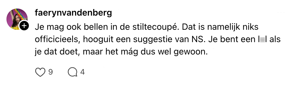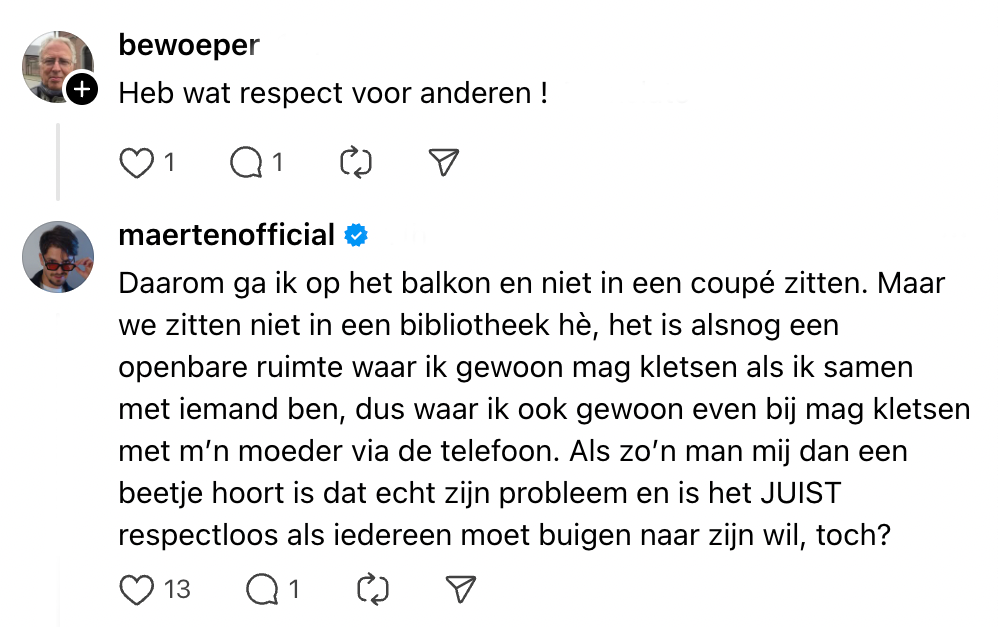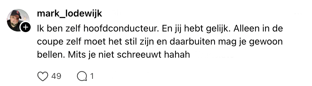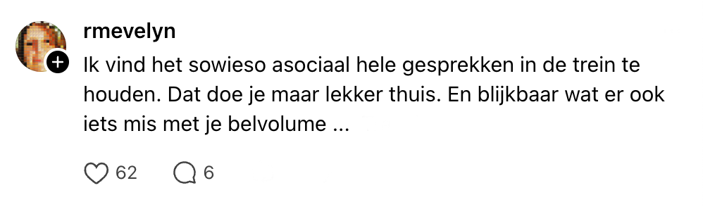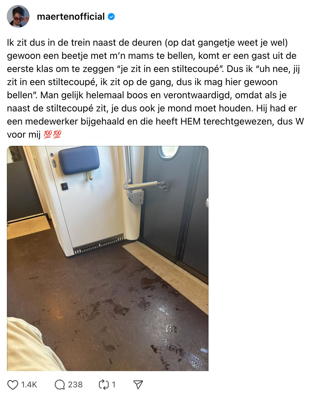 Een reis met het ov kan af en toe best lang duren en is daardoor de perfecte moment om productief bezig te zijn. Je kan bijvoorbeeld eindelijk beginnen aan het boek dat je voor kerst heb gekregen, je mailbox doorspitten of je belt je moeder om effe bij te praten. Maar wanneer Maerten zijn moeder belt naast een stiltecoupé van NS breekt er een hevige discussie los. Zelfs na bevestiging van een NS-conducteur houdt het niet op, want op Threads loopt de discussie nog harder van stapel.