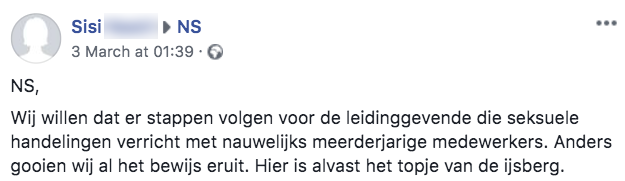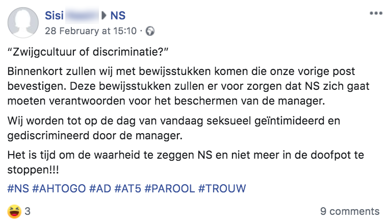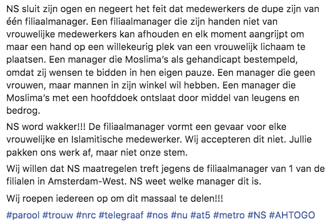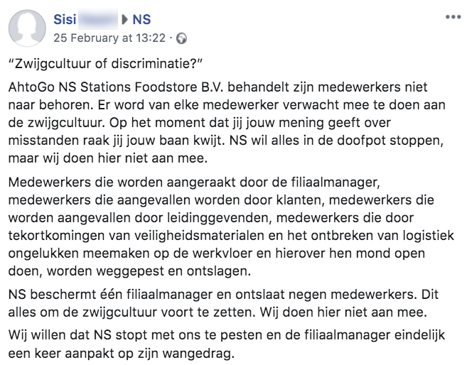 In het kort: hierin kaart ze aan dat er een filiaal van de AH to go, een keten die valt onder de NS, een ‘zwijgcultuur’ heerst. Ze beschuldigt de keten van velen misstanden die volgens haar in de doofpot worden gestopt: ongewenste aanraking door filiaalmanagers, medewerkers die worden aangevallen door klanten of leidinggevende en ongelukken op de werkvloer. De NS is in haar verhaal de hoofdschuldige vanwege het negeren van deze misstanden en het voortrekken van foute filiaalmanagers. Aan het eind van het bericht lijkt het voor om één manager in een filiaal in Amsterdam-West.