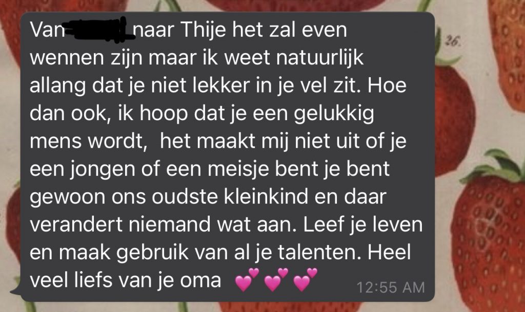 Uit de kast komen bij je familie is voor veel LGBTQ+’ers. Je wil natuurlijk niks liever dan door je familie geaccepteerd worden voor wie je bent. Ook Thije kwam uit de kast als trans bij diens oma. Ze stuurde Thije daarna een ontzettend lief appje om duidelijk te maken dat het voor haar helemaal niks uitmaakte. Thije deelt het appje op Twitter en laat vele harten smelten.