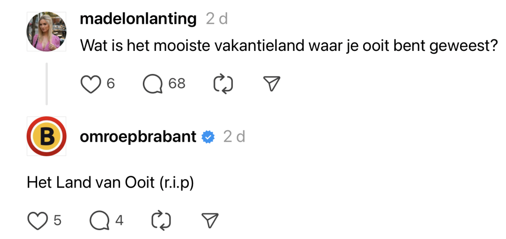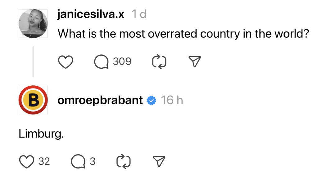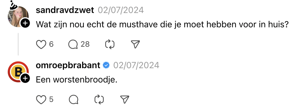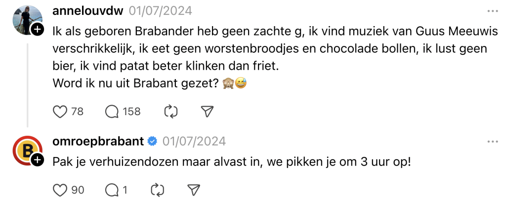 We kennen Omroep Brabant natuurlijk als de serieuze nieuwsomroep, die verslag doet van alles wat er zich in Brabant afspeelt. Een Bredase cavia die de uitslag van de EK-wedstrijd tussen Nederland en Engeland voorspelt, een overval in Eindhoven of een inwoner van Tilburg die zijn fatbike in het raam van de buurman parkeert: alles komt voorbij. Dat de omroep ook kei komisch uit de hoek kan komen, bewijzen ze met hun vlijmscherpe reacties op Threads, jonguh!