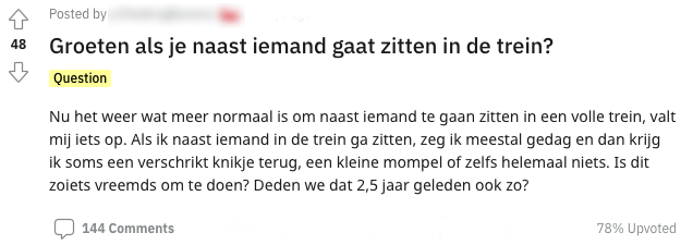 De meeste mensen die dagelijks met het OV reizen, zijn aardig op de hoogte van alle ongeschreven treinregels. Je geeft je plek op als er een bejaard persoon de trein binnenkomt, eten met een sterke geur laat je thuis en bellen doe je zachtjes. Maar wat zijn de ongeschreven regels als het gaat om iemand groeten in de trein? Een redditor stelt deze vraag en de meningen zijn erg verdeeld.