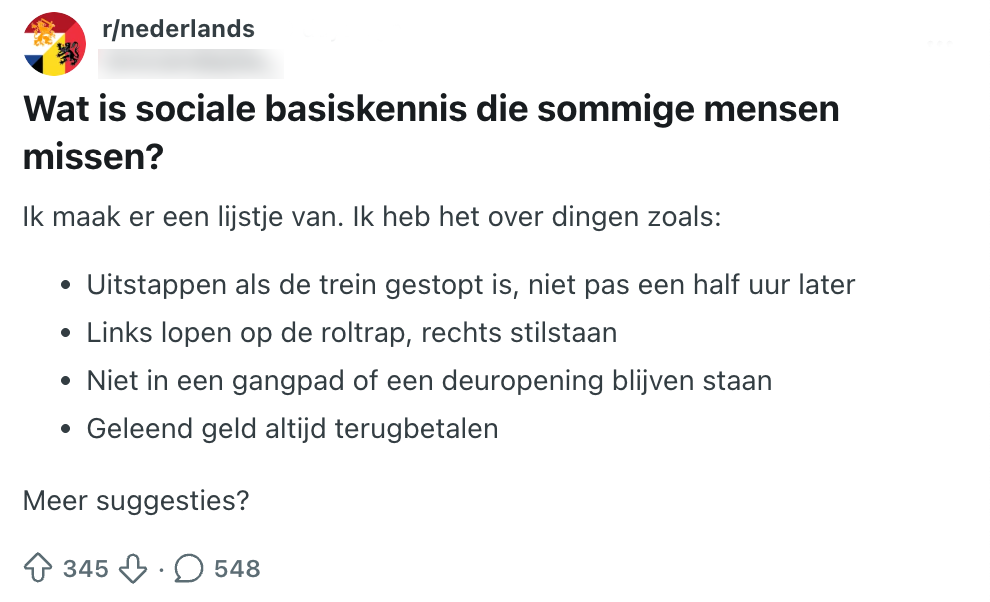 Van op tijd zijn tot je smoel houden in de bioscoop: sommige regels hoeven niet in een wetboek te staan om serieus genomen te worden. Toch lijkt dat steeds minder het geval. Deze Reddit-gebruiker vraagt zich af waar de sociale basiskennis van sommige Nederlanders is gebleven en anderen komen met nóg meer toevoegingen aanzetten.