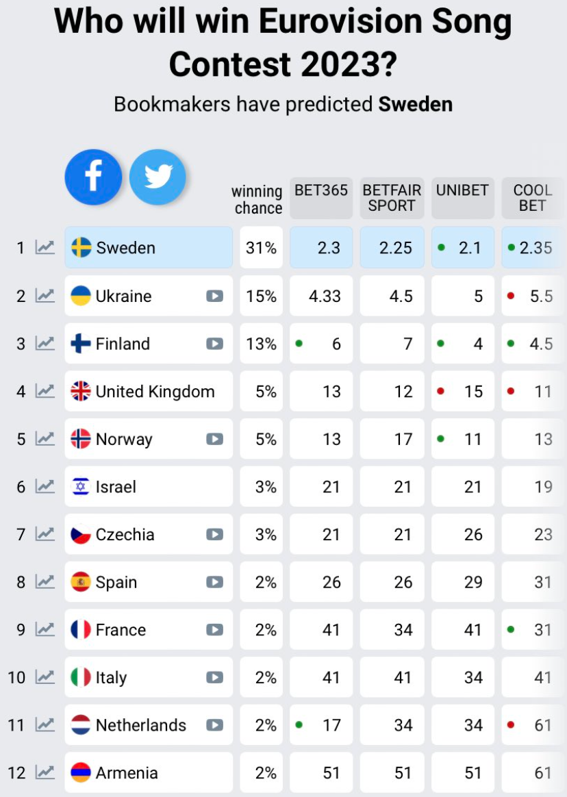 De bookmakers lijken niet onder de indruk van onze songfestival inzending. Twee plekken gezakt sinds de release gisteravond. pic.twitter.com/7TrXdgpugU