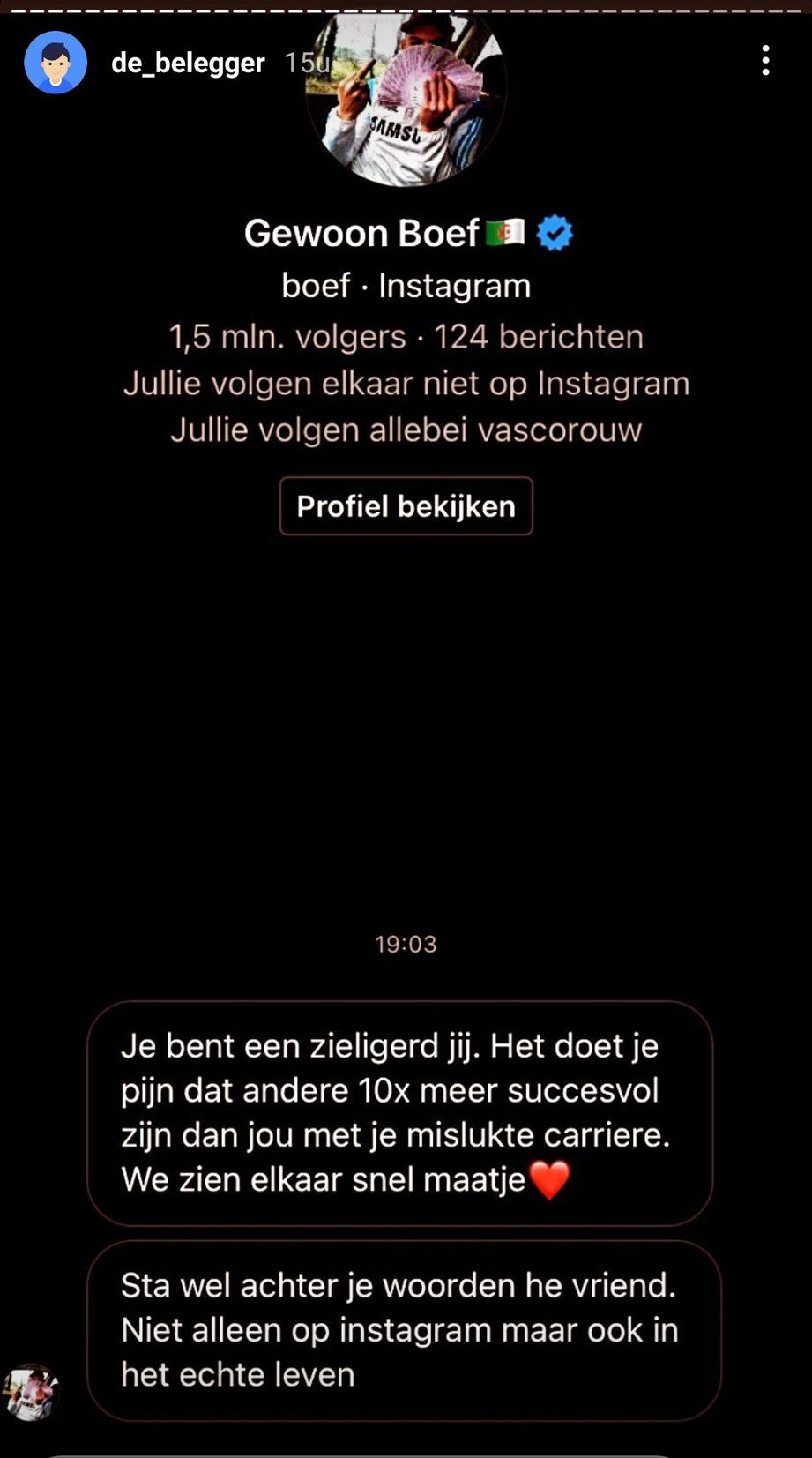 1. De Belegger deelt de volgende video in zijn stories, waarin hij vertelt bedreigd te worden door Boef