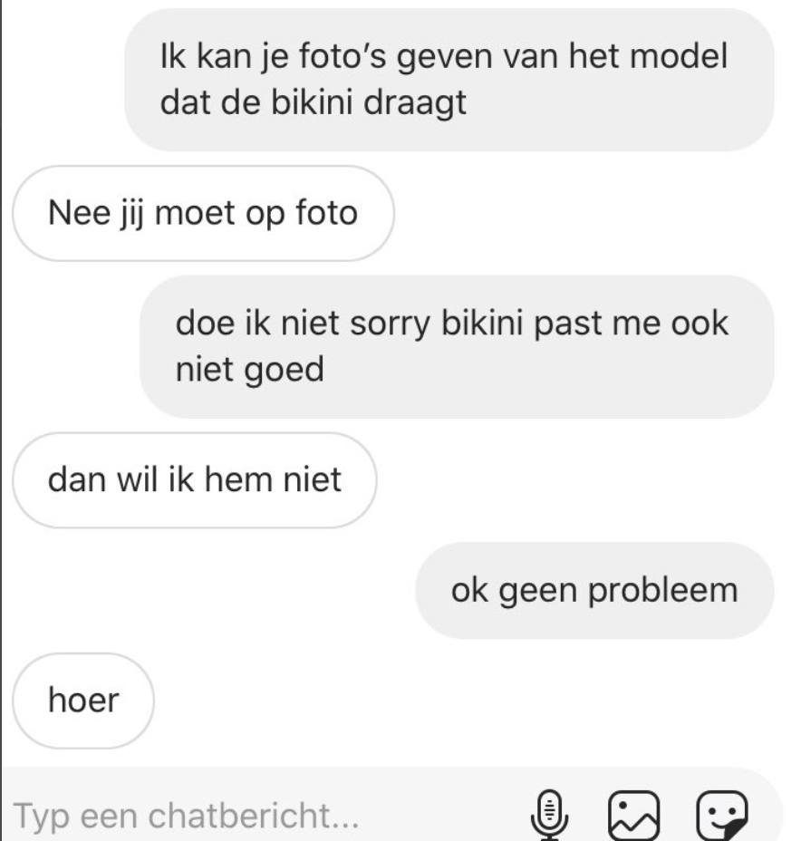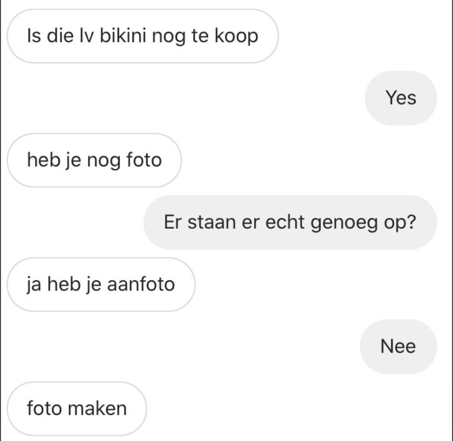 2. En ondanks dat ze al veel foto’s van de bikini in de advertentie had staan, stond de geïnteresseerde erop dat ze er meer maakte.