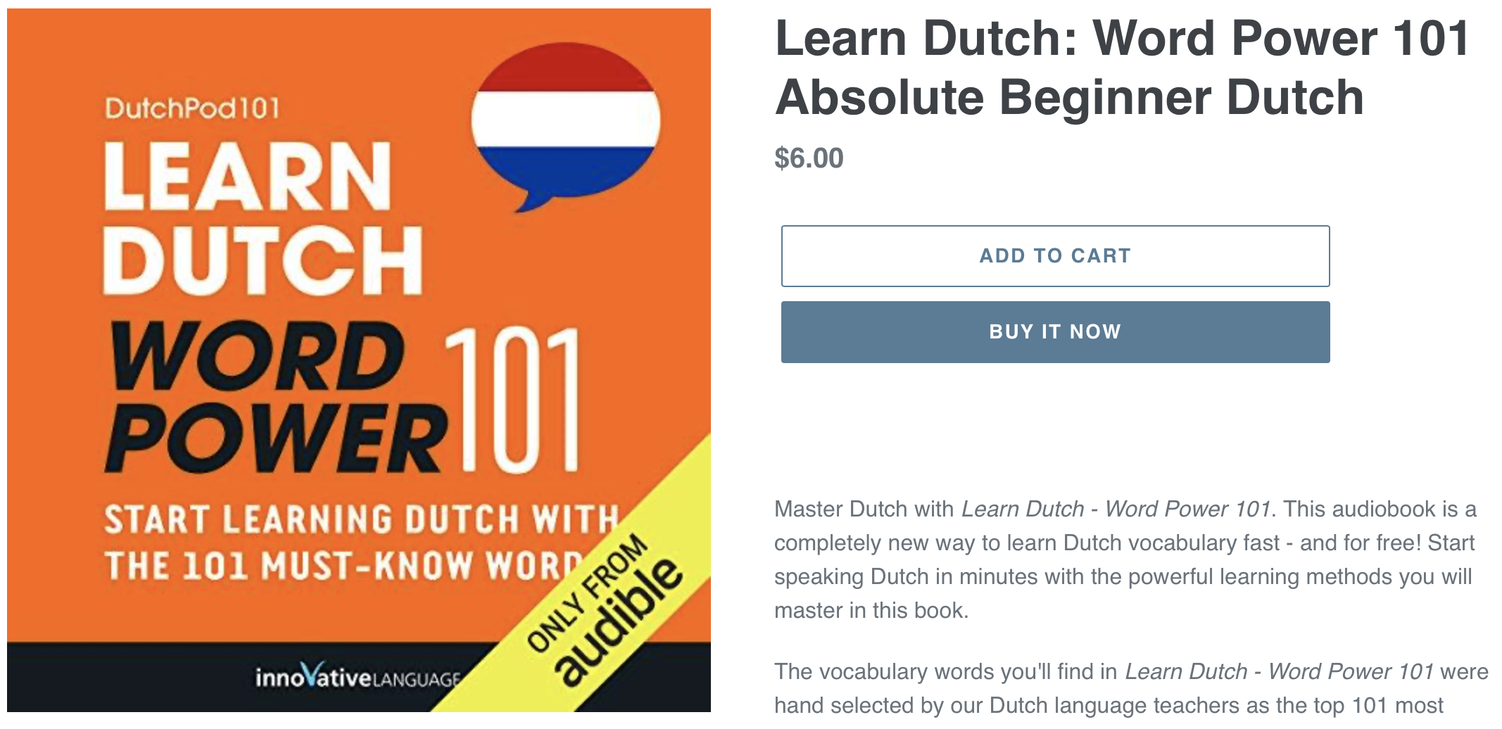 Hoewel deze geluiden ons niet direct heel hoopgevend in de oren klonken, hebben we melding gemaakt van de Nederlandstalige nepadvertentie. Tot onze grootste verrassing nog met succes ook. Wanneer we namelijk terugkeren op de link van de nep advertentie, belanden we op een pagina waarop een audioboek over de Nederlandse taal wordt verkocht. Of dit overigens direct door onze melding komt is ons niet bekend.