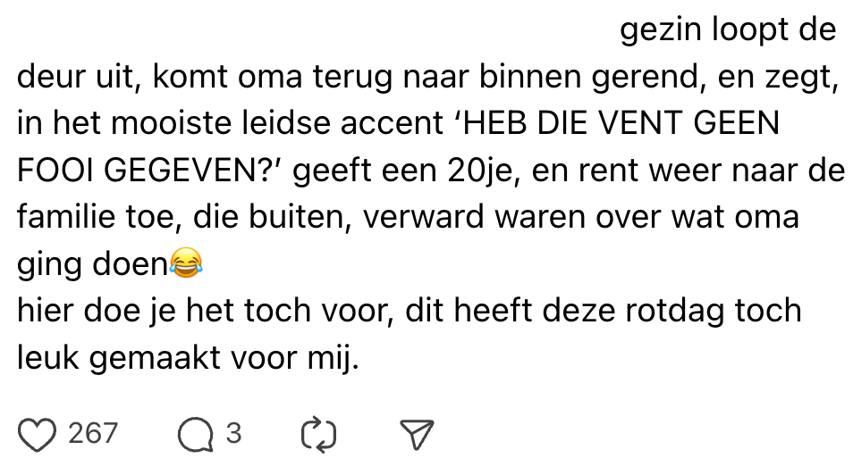 3. Eerlijk is eerlijk, voor deze reactie mag de oma ook een dikke fooi krijgen.