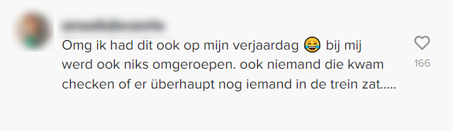 Een heel normaal treinritje pakte voor Fleur net even iets anders uit. Wanneer de trein bij haar eindstation aankwam, bleef Fleur per ongeluk zitten. Ze realiseerde zich niet dat dit het laatste station was en iedereen de trein moest verlaten, want er werd namelijk niets omgeroepen. Even later gingen alle lampen uit en moest Fleur zichzelf uit het toestel zien te redden.