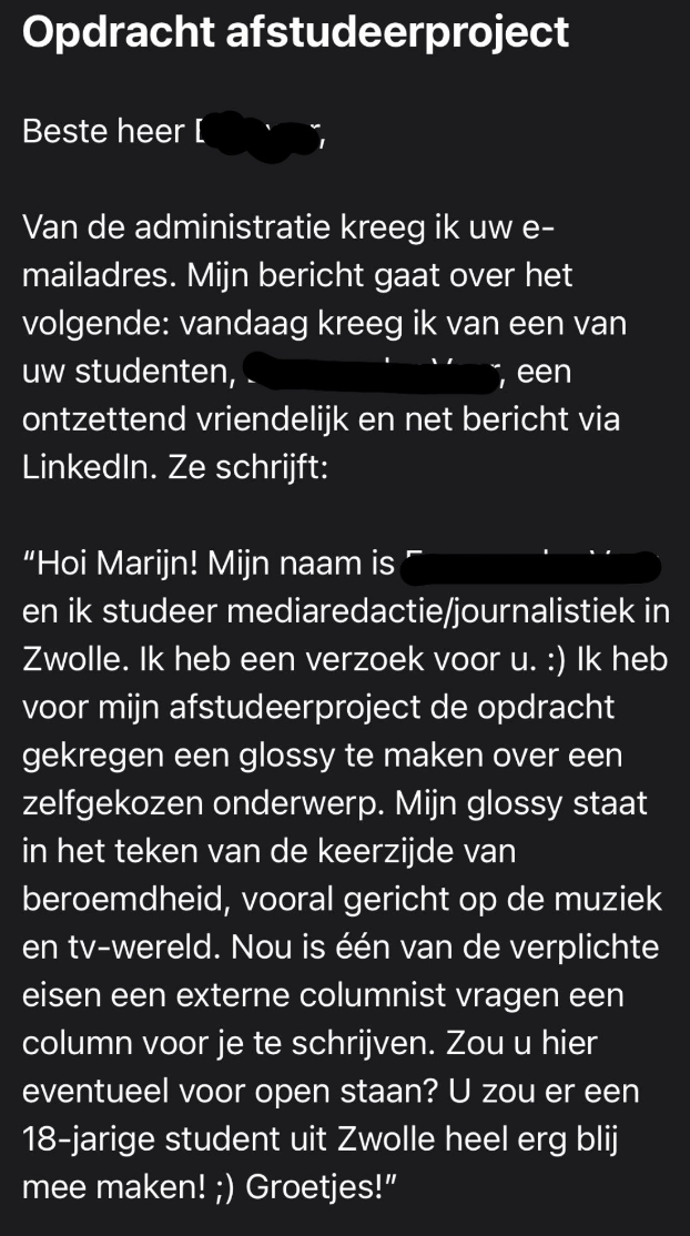 Welkom in de wondere wereld van afstudeeropdrachten. Wanneer de finishlijn van je studie in zicht is, krijg je eerst nog ff te maken met een passende uitdaging van je school. Dat geldt ook voor deze school in Zwolle. Maar wanneer journaliste Marijn de Vries in haar mailbox geconfronteerd werd met een schoolopdracht, viel dat ff niet zo lekker. Want ze kreeg een mail van een leerling, waardoor ze ontzettend veel jeuk kreeg om de school even te voorzien van een mailtje met duidelijke taal. En zo geschiedde.