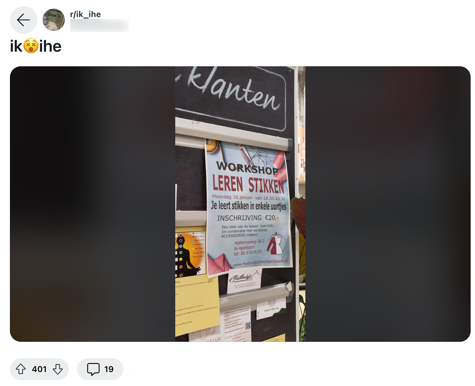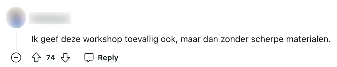 Om je kennis op een bepaald gebied bij te spijkeren, kan een workshop soms de perfecte uitkomst zijn. Toch is het belangrijk dat je de omschrijving hiervan tot in detail doorneemt, aangezien sommigen workshops binnen no time als dagbesteding aan kunnen voelen. Voor je het weet zit je namelijk met je luie reet een paar Action-slippers en hoedjes in elkaar te flansen, omdat de ‘Ibiza-tassen’ waar je een godsvermogen voor hebt neergelegd op blijken te zijn. Wanneer een redditor een dubbelzinnig briefje over een workshop ziet hangen, moet diegene toch effe twee keer kijken…
