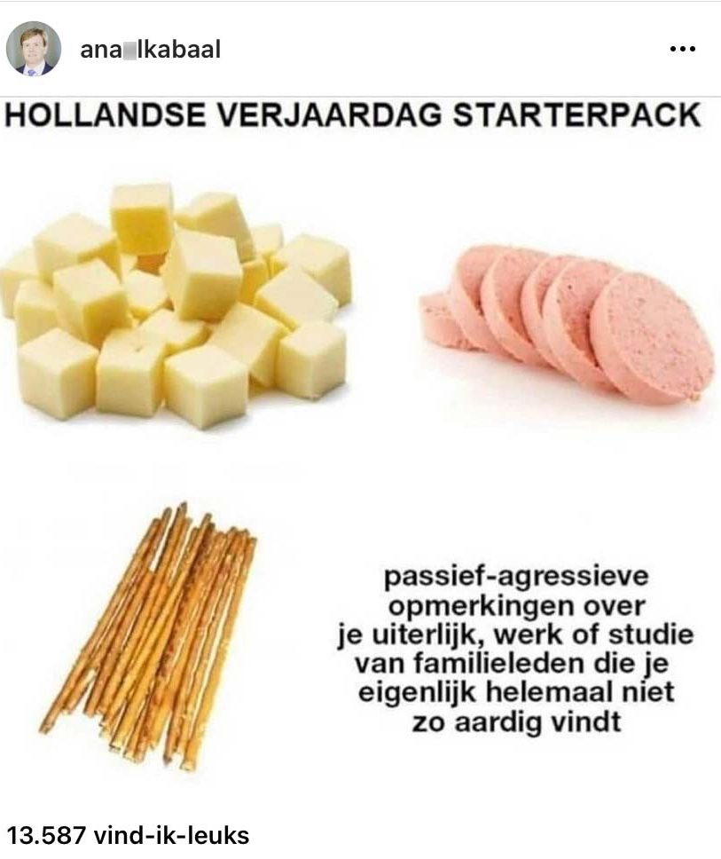 Een typische Nederlandse verjaardag? Dat schreeuwt kaas, leverworst en zoute stokjes vreten in een kringetje. Maar ook onmisbaar zijn de typische vragen en opmerkingen die je daar krijgt van je ooms en tante’s. Die je waarschijnlijk ook alleen maar op dit soort jaarlijkse verjaardagen ziet. Dit meme-account plaatste een starterspack van de Hollandse verjaardag waar dit allemaal in zit. Onder de post volgde de typische vragen die je (naast leverworst) voorgeschoteld krijgt.