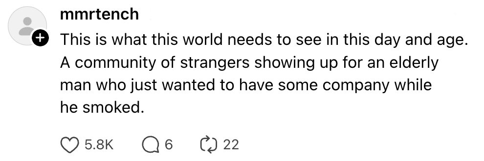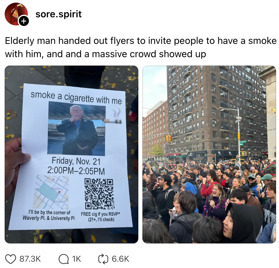 Het afgelopen jaar heb je vast een aantal bijzondere bijeenkomsten voorbij zien komen. Eerder dit jaar was er al een wedstrijd voor de beste lookalike van Timothée Chalamet en in september de strijd met elkaar om om de beste performative male te bepalen. Afgelopen vrijdag was het weer zover, maar dit keer was het geen wedstrijd. Een oudere man roept mensen via een flyer op om een sigaretje met hem te roken en wordt verrast met een opkomst waar je u tegen zegt.