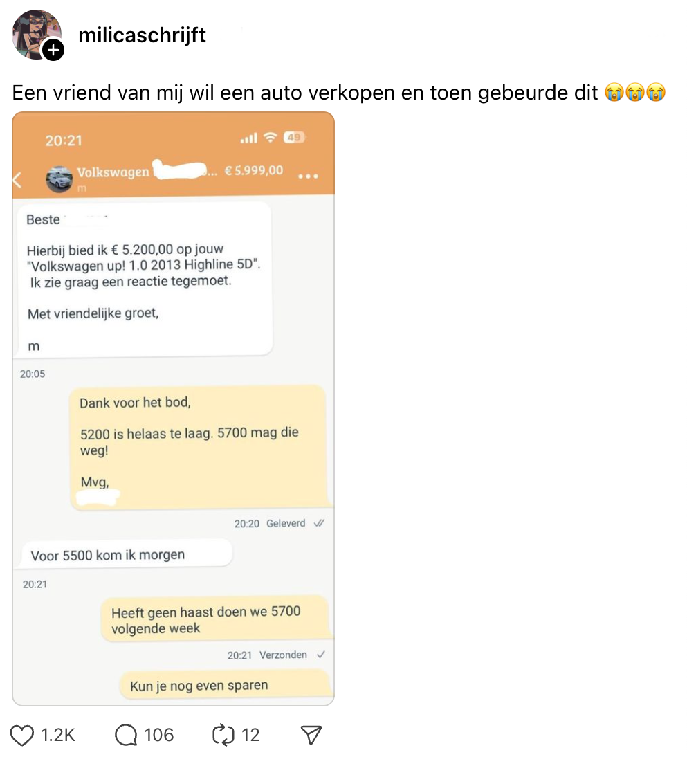 Wanneer je van iets af wil, maar het zonde is om weg te gooien, denk je waarschijnlijk gelijk aan één ding: Marktplaats. Omdat Marktplaats de perfecte plek is om koopjes te scoren, komen er allerlei soorten Nederlanders op af. Vooral gierige Nederlanders kunnen niet wegblijven, en dat zorgt voor veel bijzondere biedingen. Ook een vriend van Milica krijgt een opvallend bod op de advertentie van zijn auto. Wanneer Milica zijn reactie deelt op Threads komen andere Nederlanders niet meer bij.