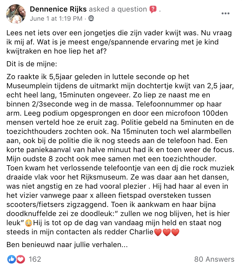 Het is als ouder een van je grootste nachtmerries. Je verliest je kind heel even uit het oog, en plotseling is hij of zij nergens meer te bekennen. Meestal is er niks aan de hand en was het kind even afgeleid door iets wat er interessant uit zag. Maar toch kan het voor veel stress en paniek zorgen. Dennenice was benieuwd naar de spannende verhalen van ouders toen ze hun kind kwijt waren. En daar werd massaal op gereageerd.