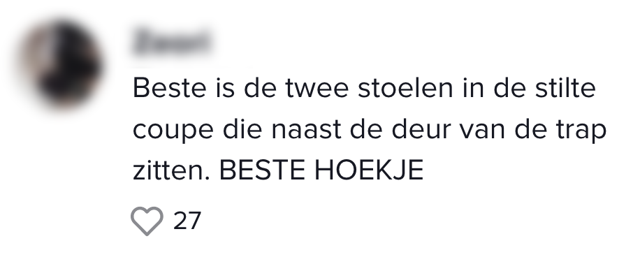 1. Een reiziger geeft een uitgebreide review van alle zitplekken in de trein.