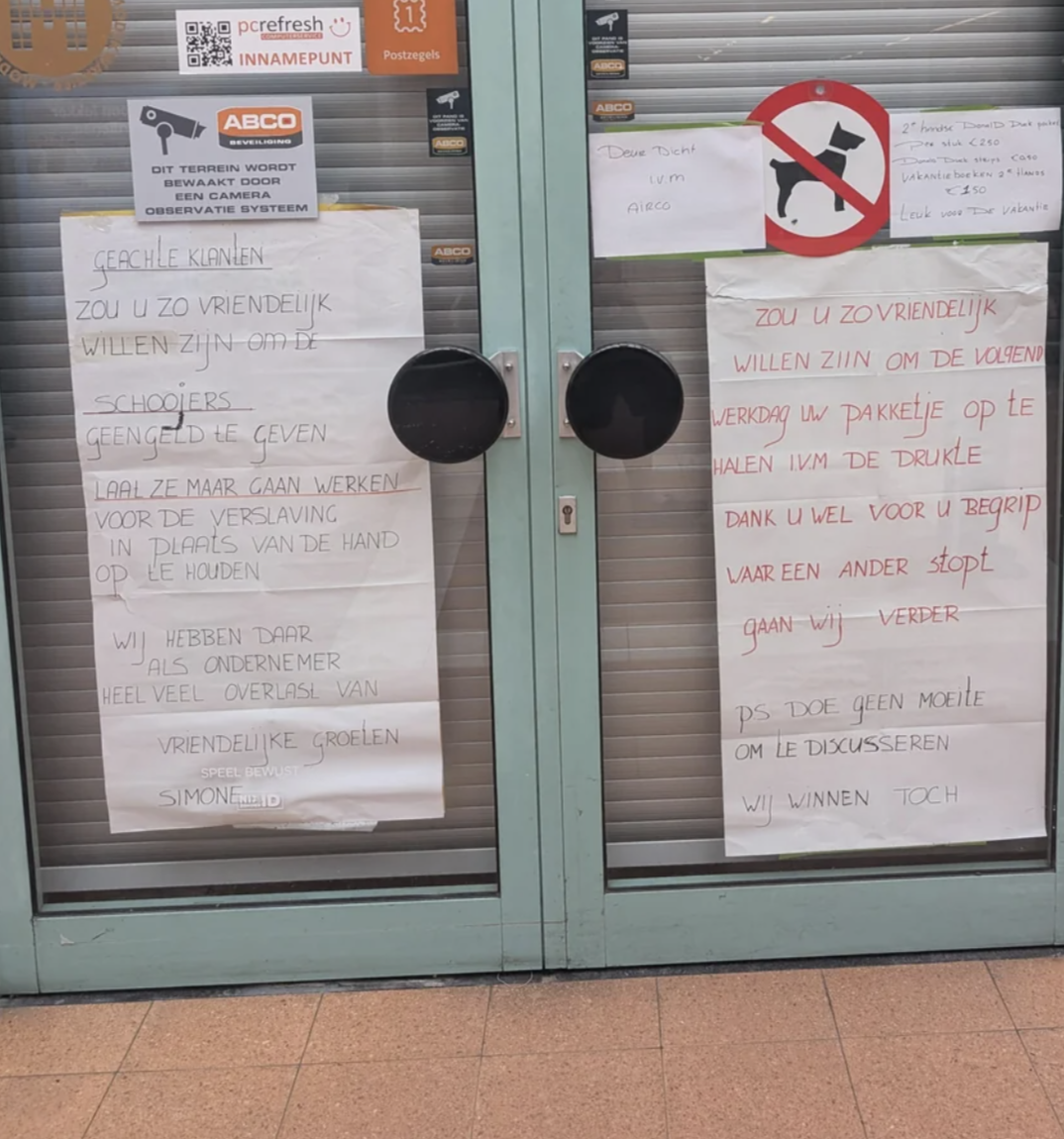 Als je een pakketje bij een afhaalpunt ophaalt, kom je soms terecht in winkels waar je normaal niet snel naar binnen zou lopen. Denk aan dat ene zaakje in het dorp verderop dat alleen maar vishaken verkoopt, of een winkel gespecialiseerd in antieke deurklinken en meubelsloten. Het is iedere keer maar weer de vraag waar je belandt. Deze Nederlander komt aan bij een pakketpunt en wordt nog voor de ingang geconfronteerd met twee niet-zo-vriendelijke briefjes. En da’s nog zacht uitgedrukt.