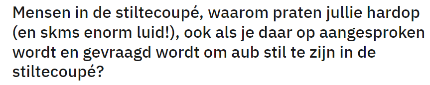 De volgende Reddit-gebruiker uitte zijn frustraties over luidruchtige mensen in de stiltecoupé, die zélfs nadat je ze erop aanspreekt, ongegeneerd door blijven krijsen. Nu is dit al reden genoeg tot flink wat irritaties bij mede-passagiers, maar deze Redditor legt uit waarom overlast bij een passagier met autisme nóg meer narigheid met zich kan brengen.
