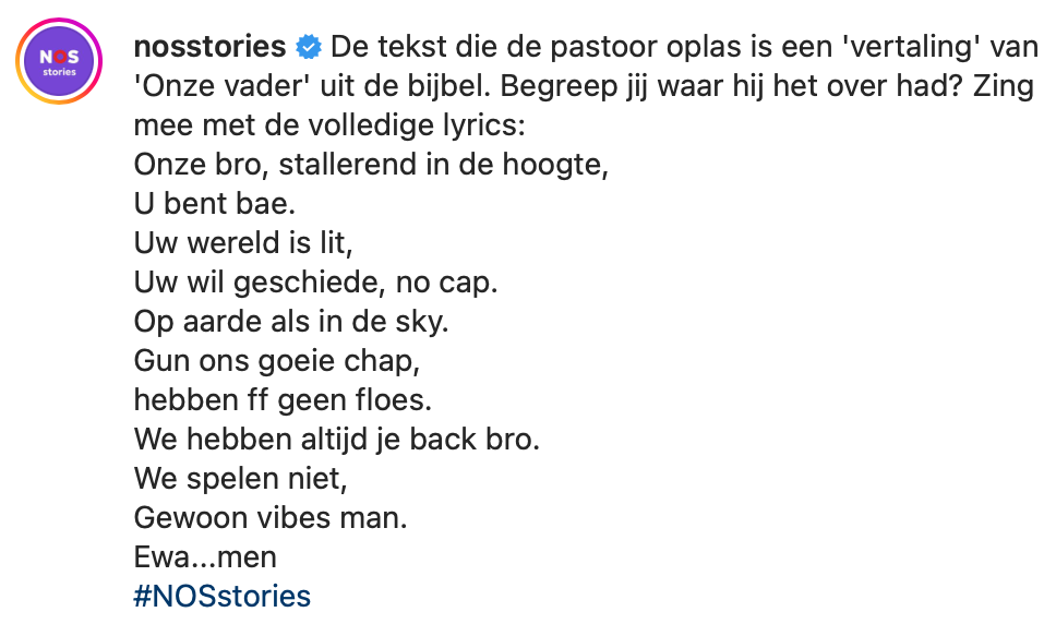 Iedereen moet tegenwoordig een beetje meegaan met hun tijd. Maar toch krabte iedereen even achter hun horen toen deze pastoor ‘Onze Vader’ in straattaal hoorden opzeggen: of kunnen we het nu beter ‘Onze Bro’ noemen?