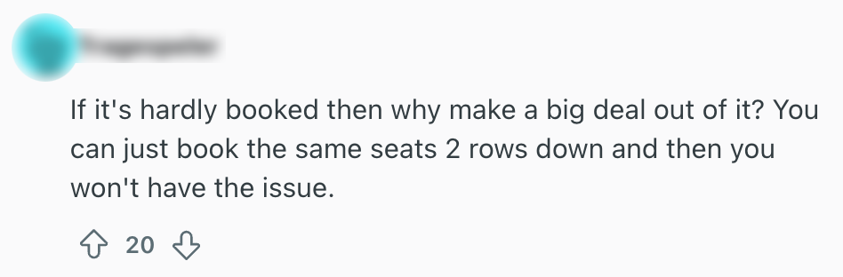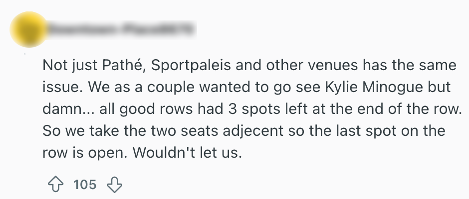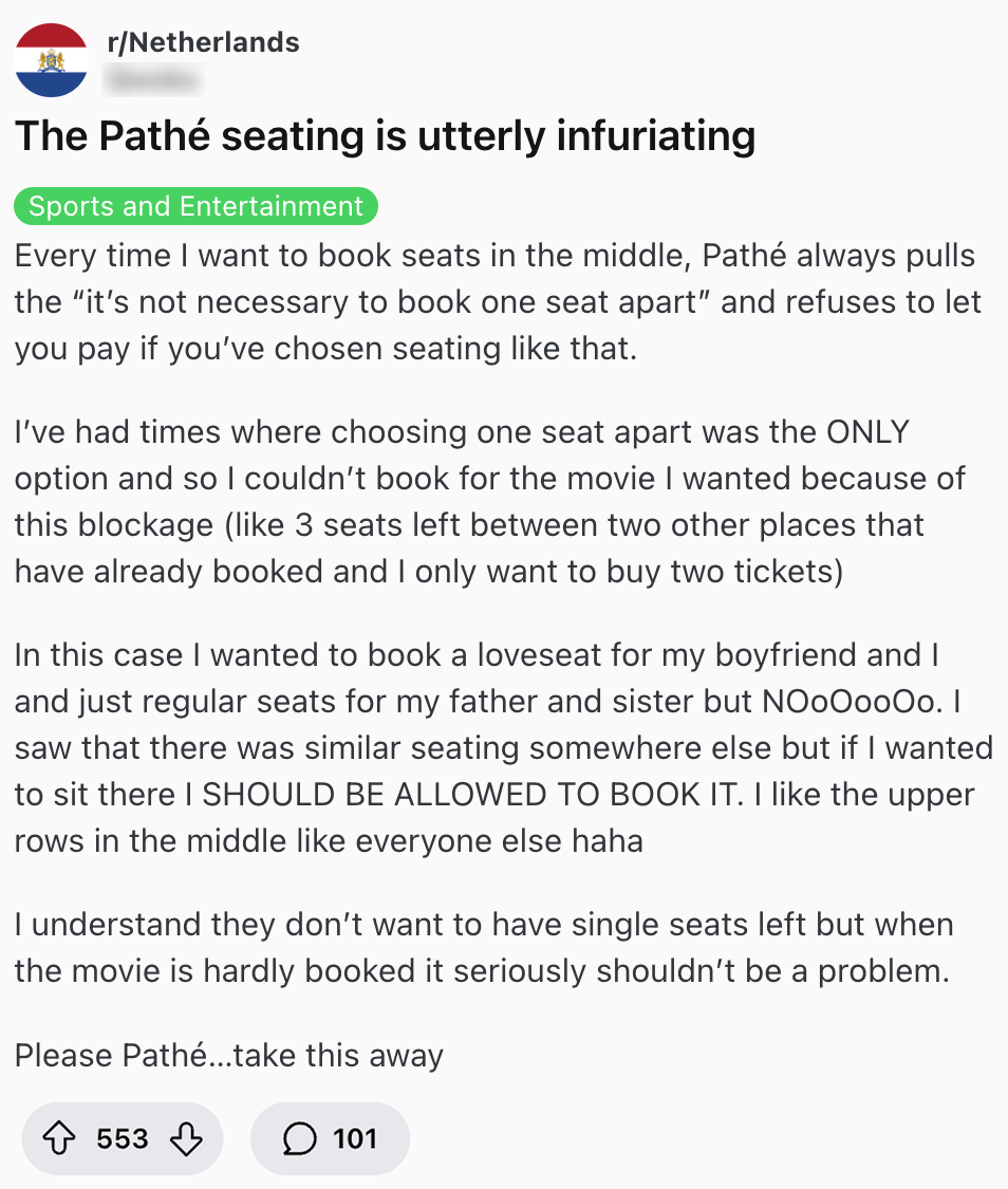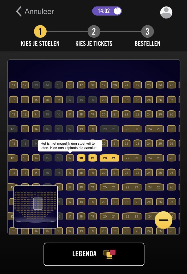 1. Deze bioscoopbezoeker wil vier stoelen in het midden boeken, maar daar steekt Pathé een stokje voor.