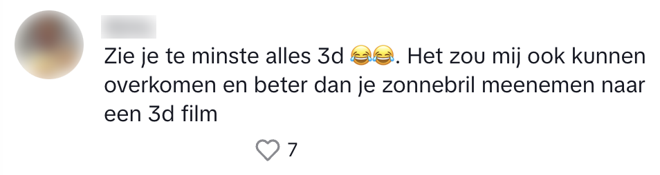 Met het lekkere weer van deze week kan een zonnebril natuurlijk niet ontbreken. Je hebt immers geen zin om compleet verblind te worden door de zon en een permanente frons op je voorhoofd te ontwikkelen. Mirna grist haar zonnebril mee wanneer ze naar buiten gaat, maar maakt in dat korte proces een klein foutje. En dat komt allemaal door een 3D-film die ze de dag ervoor bij Pathé heeft bekeken…