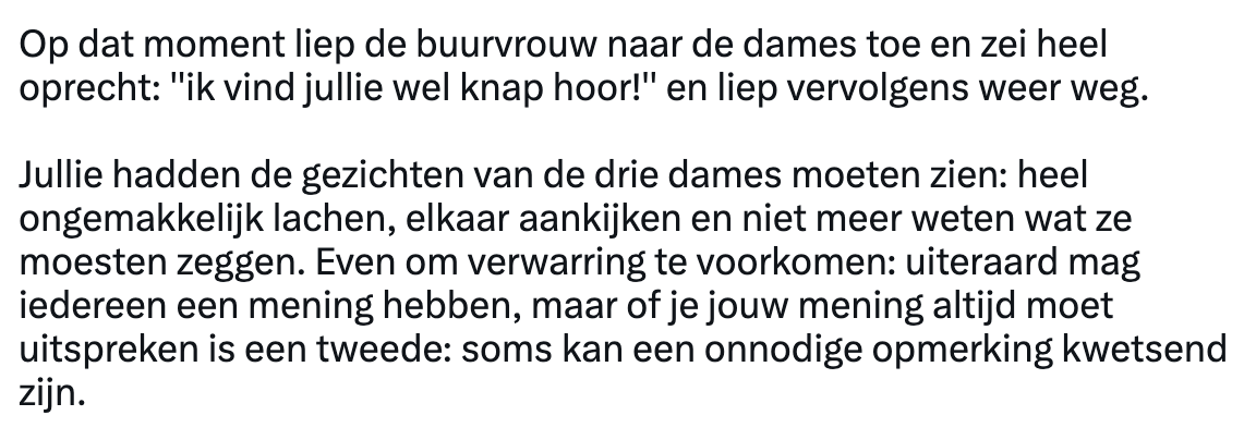 Vind het echt schokkend eigenlijk dat dat op die leeftijd nog gebeurd. Erg puberaal gedrag. Als ik die dames was zou ik me kapot schamen en jouw buurvrouw heeft even laten zien wie het meest volwassen is in deze situatie. Erg knap van haar!
