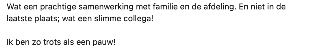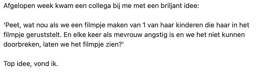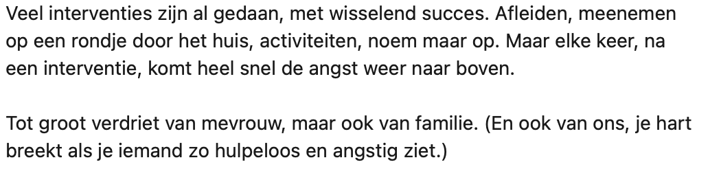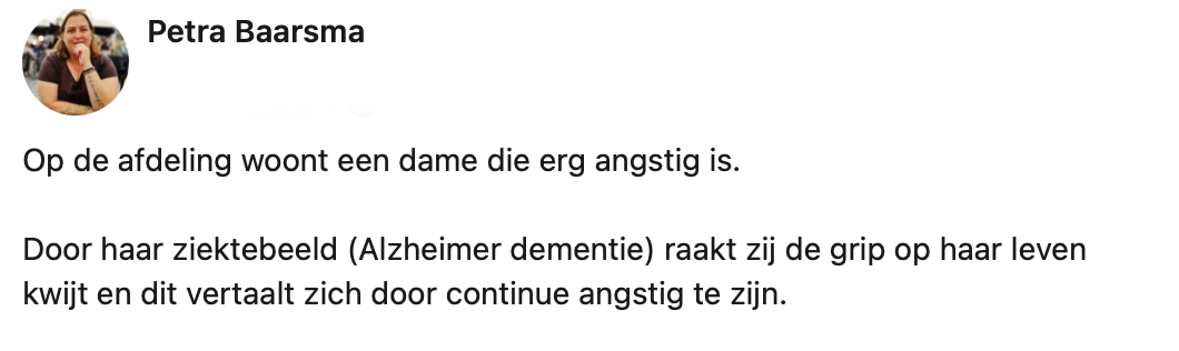 Petra werkt in de zorg en deelt met enige regelmaat verhalen die zij meemaakt op haar werk. Sommige verhalen maken indruk, net als dit verhaal dat gaat over een vrouw met dementie. Want ondanks dat dementie een ongeneselijke ziekte is, weet Petra er samen met haar collega creatief mee om te gaan.