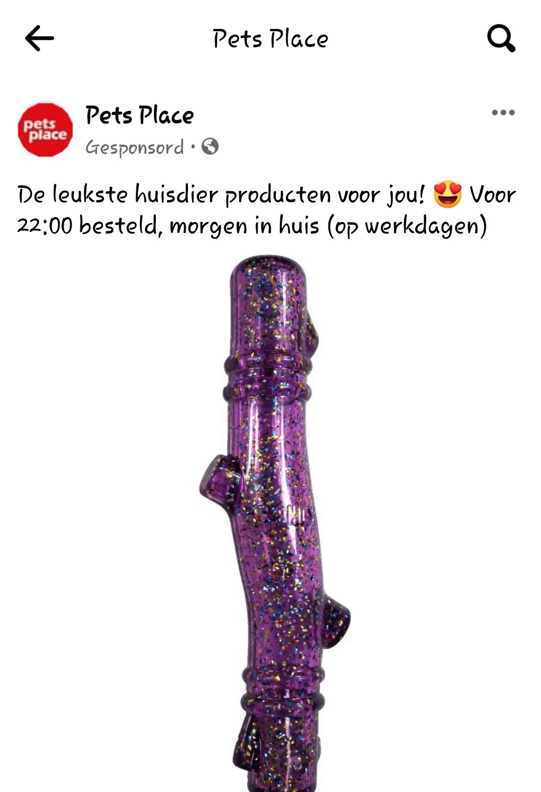 Het is paars, langwerpig, glanzend, gemaakt van siliconen en het heeft de vorm van een cilinder met een rondlopende punt. Als je nu eerder denkt aan een speeltje voor in bed dan aan een hondenspeeltje, maak je dan vooral geen zorgen: je bent niet de enige. Wanneer een vrouw nietsvermoedend langs een reclame van Pets Place scrolt, heeft ze effe het idee dat ze naar een wilde advertentie van een totaal andere winkel zit te kijken. En eerlijk is eerlijk: dat kan helemaal niemand haar kwalijk nemen.