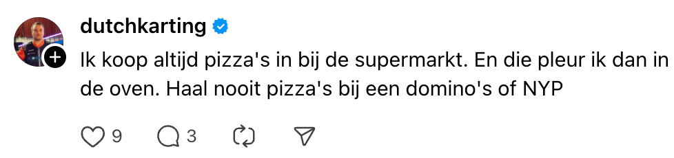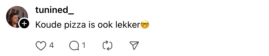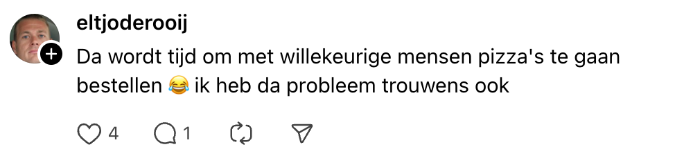 Alleen al bij de gedachte aan pizza krijgen we het helemaal warm. Zeker een aanbieding van je favoriete pizzeria kun je natuurlijk niet aan je voorbij laten gaan. Toch heeft Jip met één specifieke aanbieding nogal een probleem: de één plus één gratis aanbiedingen. Jip is namelijk zo single als een pringle, en dan zijn twee pizza’s vaak toch nét iets te veel van het goede. Ze deelt haar frustratie op Threads en dat blijkt tot haar verrassing toch meer aandacht te krijgen dan verwacht.