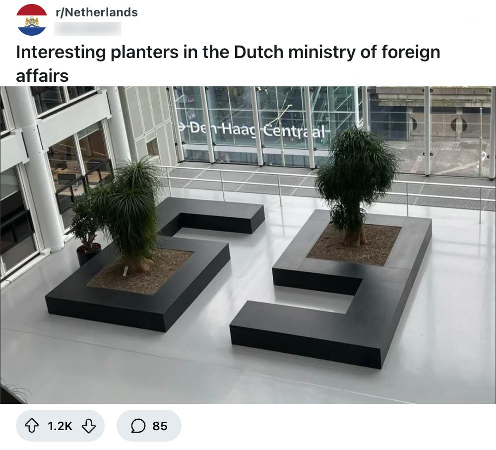 Als je aan de overheid denkt, gaan je gedachtes waarschijnlijk niet naar zoetsappige werknemers die alles goed vinden, maar naar deftige mensen in pak die alles in de gaten hebben. Dat is best logisch, want de verschillende afdelingen gaan grotendeels ook over serieuze zaken. Hoewel het Ministerie van Buitenlandse Zaken serieus werk doet, straalt het interieur een heel andere vibe uit. Een Reddit-gebruiker spot namelijk erg bijzondere plantenbakken in het gebouw en andere Nederlanders krabben zich achter de oren.